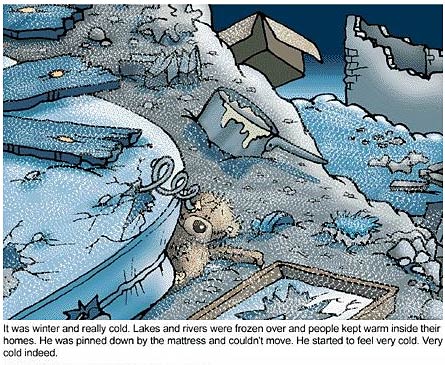 时值寒冬,河流已经结冰,人们都躲在屋子里面取暖,只有这只可怜的小熊孤零零的被压在许多的垃圾当中。在寒冷的冬夜,小熊棕色的皮毛已经被冻得掉了颜色,变成了深暗的灰色,鼻子也变成了蓝色,天空飘下了一朵朵的雪花,它感到无比的孤独与伤心。