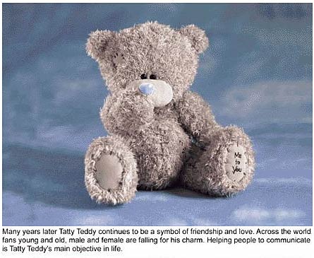 几年后,Tatty Teddy成为友情和爱情的象征,忙着帮助人们联络情感。它的脚上绣着“Me to You”。两个人之间的距离,人不能搞定,泰迪熊却可以。