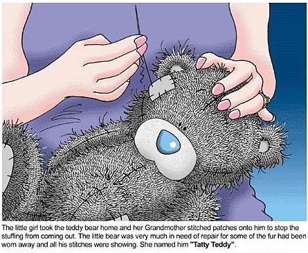 女孩把泰迪熊带回家,请祖母帮泰迪熊把破的地方打上补丁,清理好。女孩替它起了个名字叫Tatty Teddy。我们这里也叫它乞丐熊或者补丁熊。