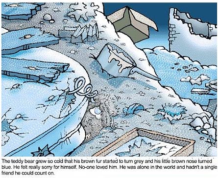 在寒冷中,棕色的小泰迪熊冻得掉了色变成只小灰熊,鼻子被冰成了蓝色,一朵白色的雪花凝固在蓝色的鼻尖上。没有人爱它,没有一个朋友,只有孤独陪伴,泰迪熊很伤心。