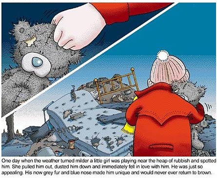 这就是乞丐熊的故事,悲伤而又温馨。如今,这只小熊已经获得了众多FANS的爱,不再孤独与伤心,相信喜爱毛绒玩具的你一定也曾关注过这只特别的小熊吧,用你的爱心去温暖它悲伤的过去。它左脚上绣的“me to you”字样意思是“我给你”,现在已经成为了传递爱情与友情的象征,拉近着人与人之间的距离。