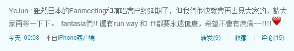 YeJun : 虽然日本的Fanmeeting和演唱会已经延期了,但我们很快就会再去见大家的,请大家再等一下下。 fantasia们!! 还有run way 和 f1都要永远健康,希望不会有病痛~~!!!!