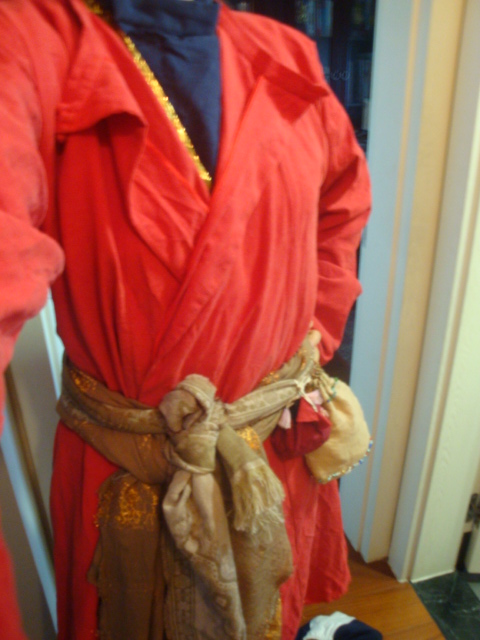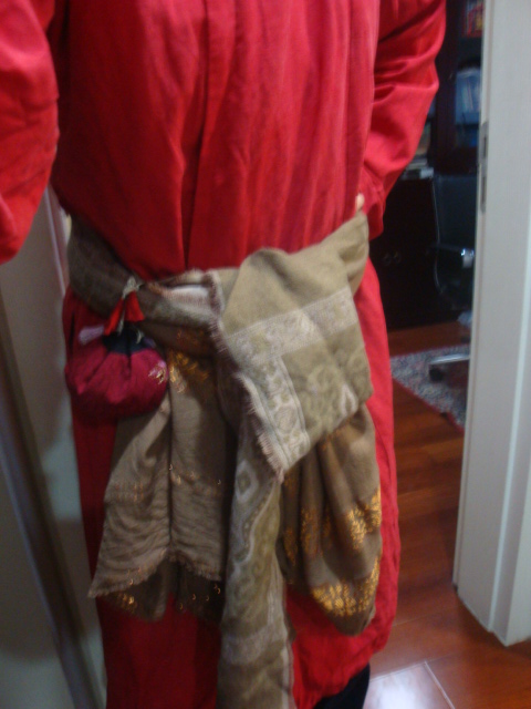身上穿的是圆领中衣,唐半臂,条纹裤,唐圆领袍,腰上系了围巾两条,布袋两个