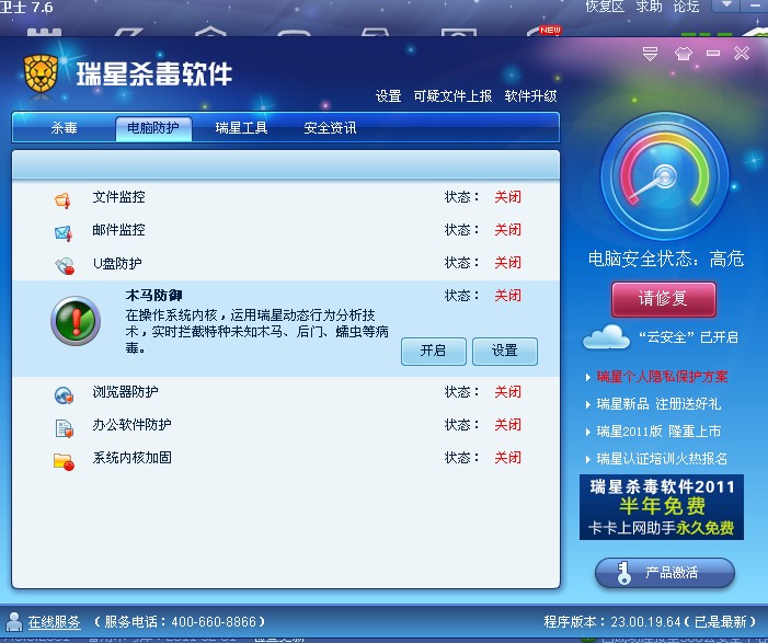 瑞星的防护全部无法开启,怎么回事???