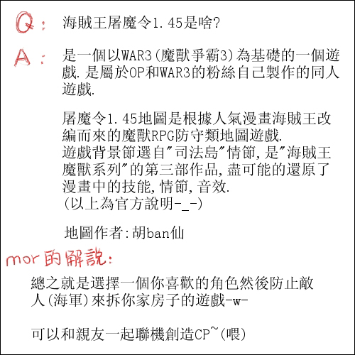 [海贼王屠魔令1.45]是一张WAR3基础上做出来的魔兽RPG防守类地图游戏.