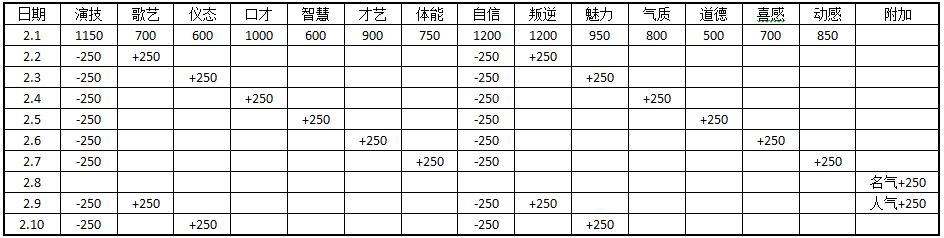 每月以下日期生日会附加的人气和名气(其他日期人气和名气则均为基数不会有变化,这8个特殊日子就等于总数多了250点数值,因为这8天的其他数值并没有减少):
