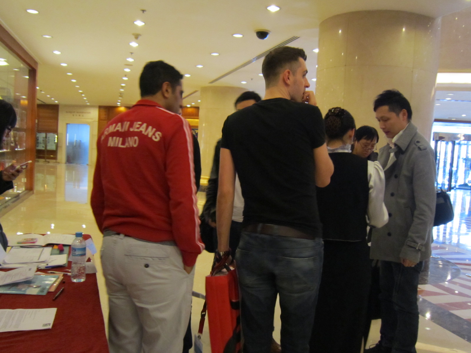我是上完课之后去的酒店,朋友11点20分给我发短信说小塞已到酒店,是跟艾伯顿一起过来的。我12点40左右到达日航,发现小塞和muke在餐厅里闲聊天,我大概整理了一下礼物及笔记本什么的准备进去,不巧碰到几个外国友人抢先上去跟小塞打招呼,貌似是熟识的朋友,之后几人便坐下聊开了。我就没再往里面走,在外面等他出来,可能过了没会儿,他到接待处问询入住事宜(可能是帮那几个友人),我就过去把礼物交给了他,跟他说明了我来自塞吧,希望他能够给吧里的筒子签几个名,他开心地收了礼物,很乖地签了名。之后就又游荡进去了(餐厅),没一会儿muke跑出来晃,我就上前说四喜跟生花明年会来北京看比赛,还说生花给你发了短信但你并没回,muke指了指天说,那时我们在飞机上,之后给他拍了个半身像,他就晃会餐厅去了。