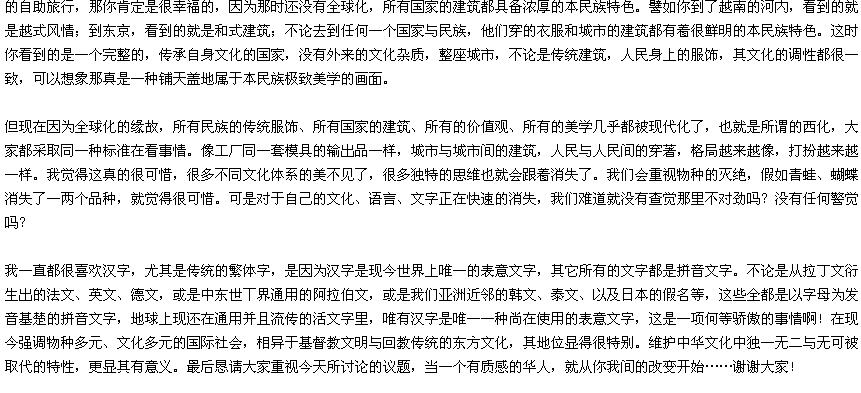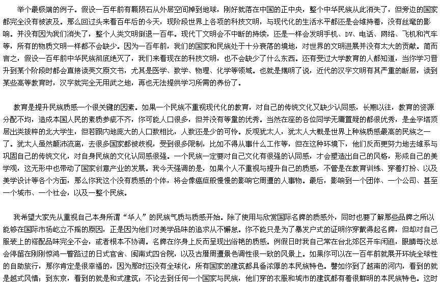 很高兴来到北京大学和各位同学进行这场文化上的交流与经验的分享。我今天所要演讲的题目是:“一个没有质感的民族。”我在这里所指的民族,不是别人,就是我们华人自己。而华人一词的称谓泛指包括内地、台湾、香港、星马、与东南亚一带的传统华侨,以及美加地区的华裔新移民等。