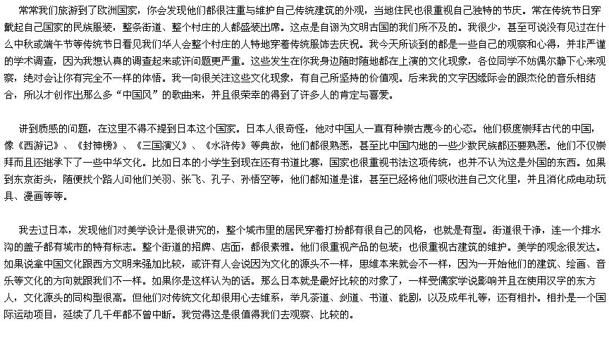 我想可能很多同学都已注意到,我写了很多所谓“中国风”的歌词作品,譬如《娘子》、《双截棍》、《爷爷泡的茶》、《东风破》,还有最近的《菊花台》、《千里之外》等。其实这些歌词中浓厚的古诗词韵味并不是偶然间产生的,作品是最能够反映一个人的价值观跟性格的。一直以来我就是一个民族意识很重的人,长期性的关注跟民族、传统、与文化相关联的议题。当我这种文化意识跟音乐相结合起来时,就自然而然的孕育出所谓“中国风”的歌词,这是首先跟大家解释为何我会创作出如此倾向的作品。