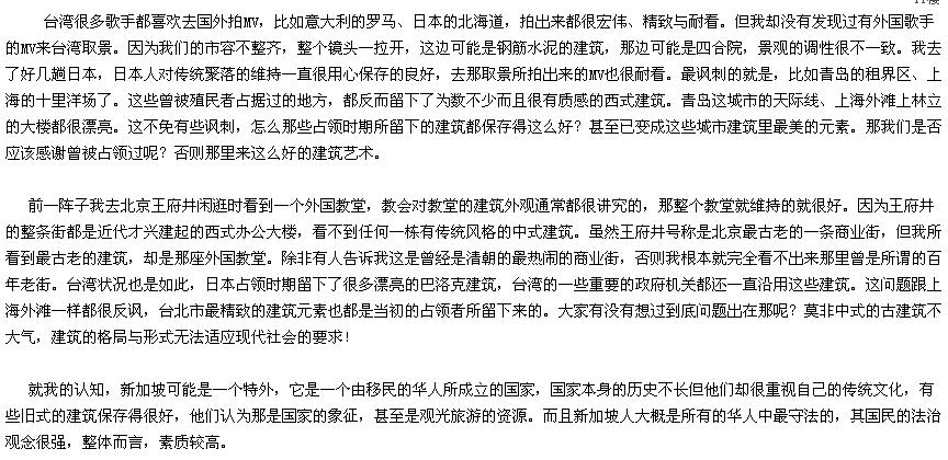 现再以城市为例来说明,不禁要问为何大多数华人居住的地区都不是很有质感。城市建筑是国家形象最具体的象征。但在台北市,据我所知,大楼外观的建筑形式与色彩调性从来就没有被规范过。市区街上,每个店面的装潢都很有特色,看的出有某种美学的追求,都可以被独栋独店的欣赏。但你只要把镜头一拉开,一扩大,用较大的视野全方位的去看整条街、整个城市的轮廓,你就会发现根本就杂乱无章,城市基调混乱,房子盖的毫无章法。一个城市的建筑反映了一个民族的质感。有质感的东西是可以深入骨髓的,那是文化底蕴浓稠度的一种展现。当你犹如追星族去追求昂贵的舶来品时,实际上正是以某种自卑的心态去追求你自己认为有价值的东西,一种心理上的反差与补偿心理。而台北就像个浓妆艳抹下的模特儿,急于讨好国际上的眼光,却根本就已模糊了自己原本的面貌,完全没有了自己的风格。