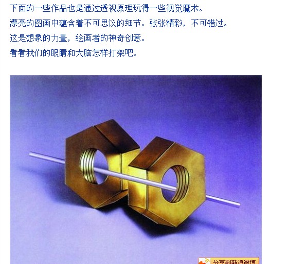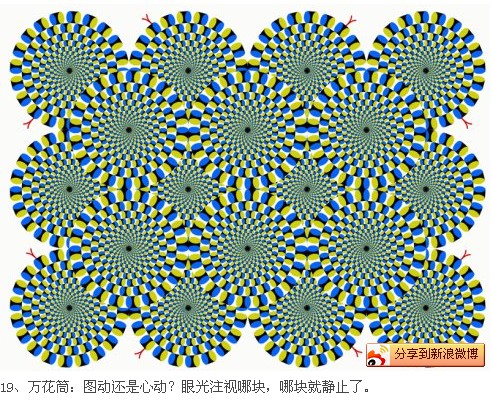 每一个小圆的“缠绕感”通过大圆传递出去产生了螺旋效应。遮住插图的一半,幻觉将不再起作用。1906年英国心理学家詹姆斯.弗雷泽创造了以整个系列的缠绕线幻觉图片