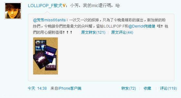 @LOLLIPOP_F阿纬:在舞台上 @LOLLIPOP_F小煜 在唱一拳让他瓦解 @LOLLIPOP_F敖犬 跟 @LOLLIPOP_F阿纬 在积极找地板落地,但...有谁能告诉我 @LOLLIPOP_F威廉 你在干嘛?? 原文转发(281)|原文评论(245)
