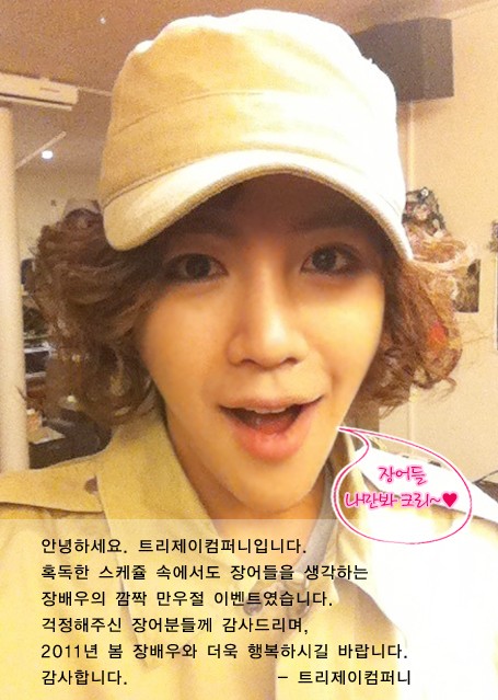 大家好.这是树公司.即使是在忙碌的日程中 想着鳗鱼们的张演员也给大家准备了突然的愚人节礼物 感谢为此担心的鳗鱼们 希望在2011年春天能和张演员一起更加幸福 谢谢 张根硕对白:鳗鱼们,只能看我cri~❤