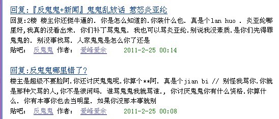数次在反鬼鬼吧进行辱骂回帖