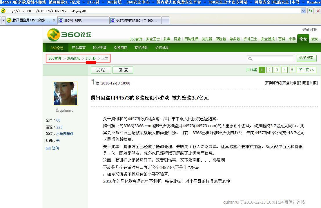 《腾讯因盗用44573的多款小游戏 被判赔款3.7亿元?》http://bbs.360.cn/4261899/40665095.html