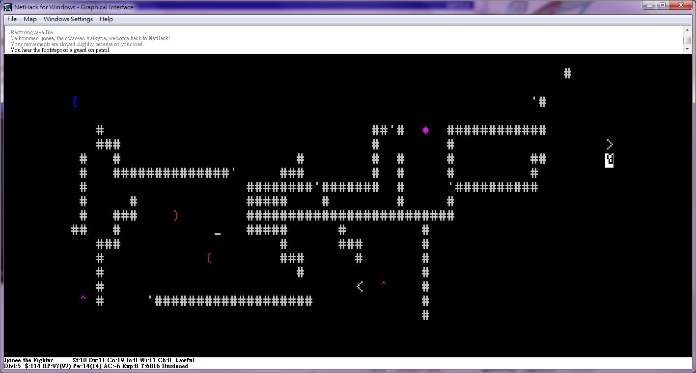 其实关於这个游戏, “看不见墙” IBMGraphic,DECGraphic选项等都是以前电脑的标准问题, 现在以经没了这回事(当然设错多少也有问题), 一定要用文字介面玩这思路, 除了口味以外, 多少是有点不对的, 虽然是roguelike, 但现在是没必要一定玩文字介面的, 文字介面这东西只是以前电脑没太好的原因, 新手老手也好, 用3楼的图像介面档玩就可以了.