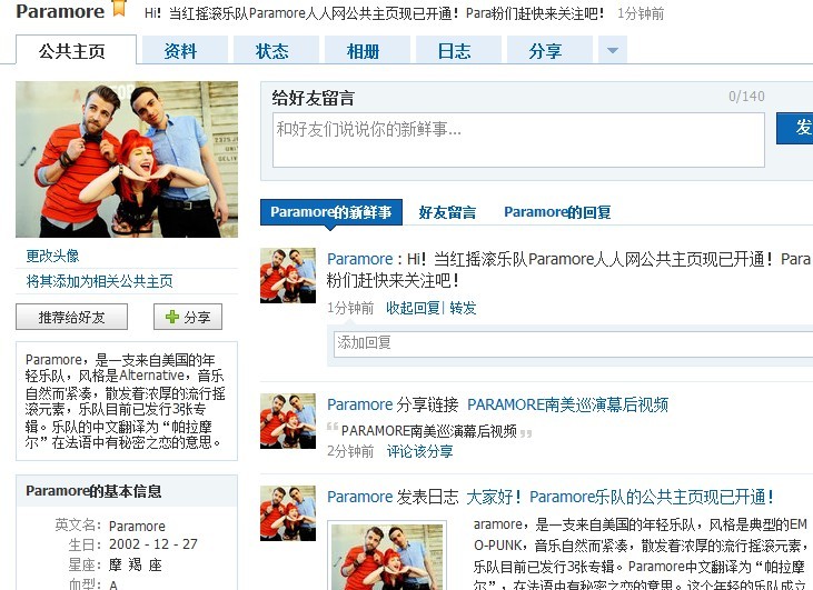 有人人网账号的记得到时候搜索Paramore加我关注哦!