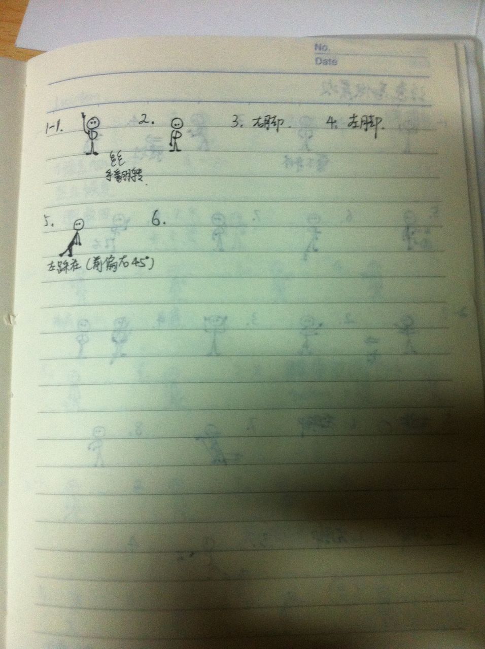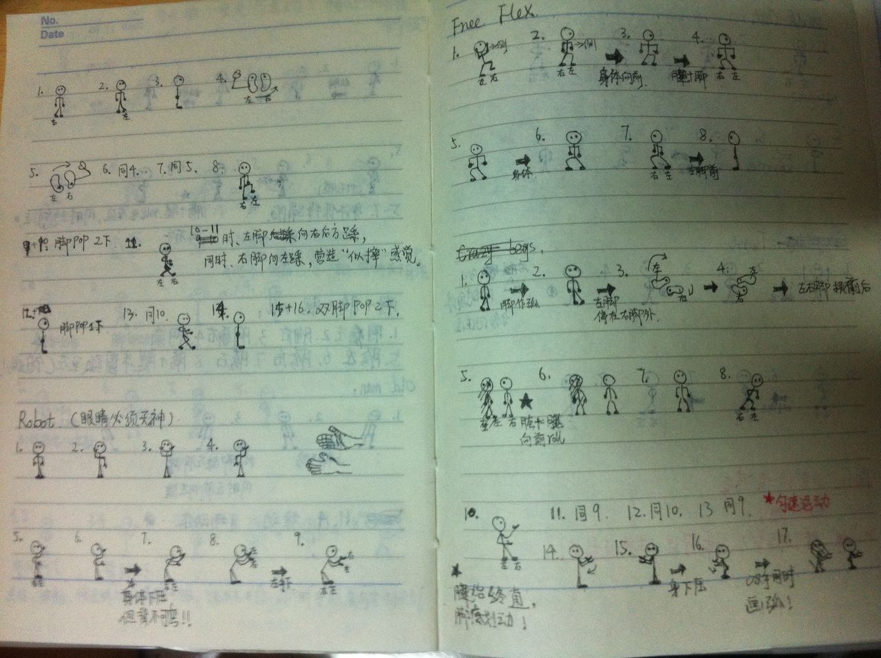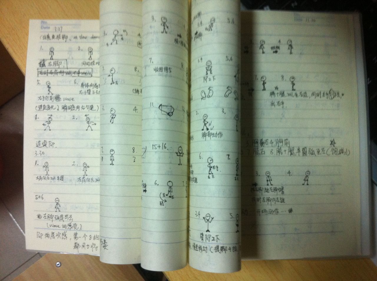 而且担心忘记动作、所以每次课后回宿舍,都回忆老师教的动作,然后记录在本子上。