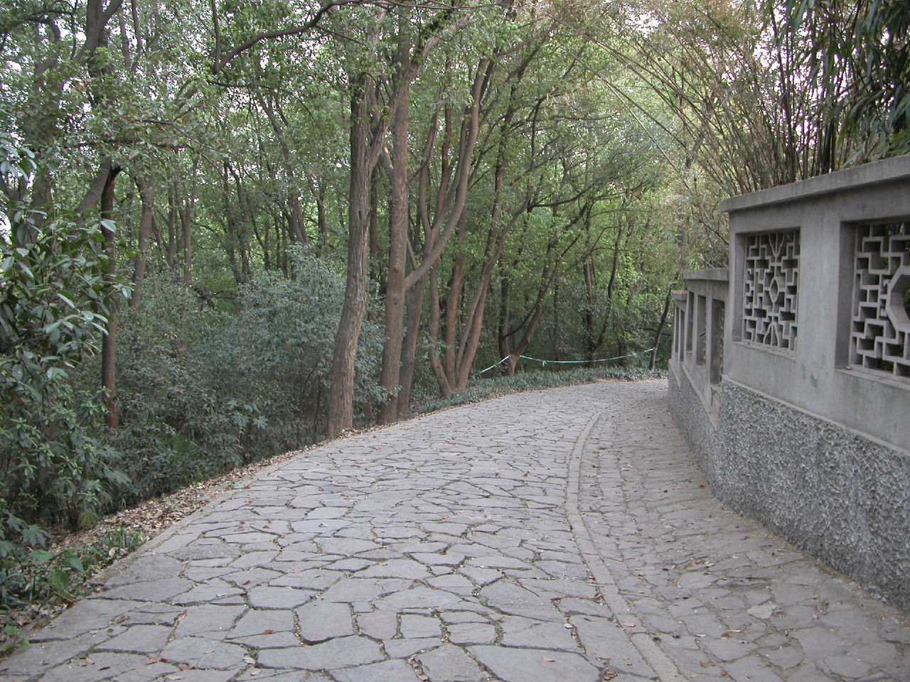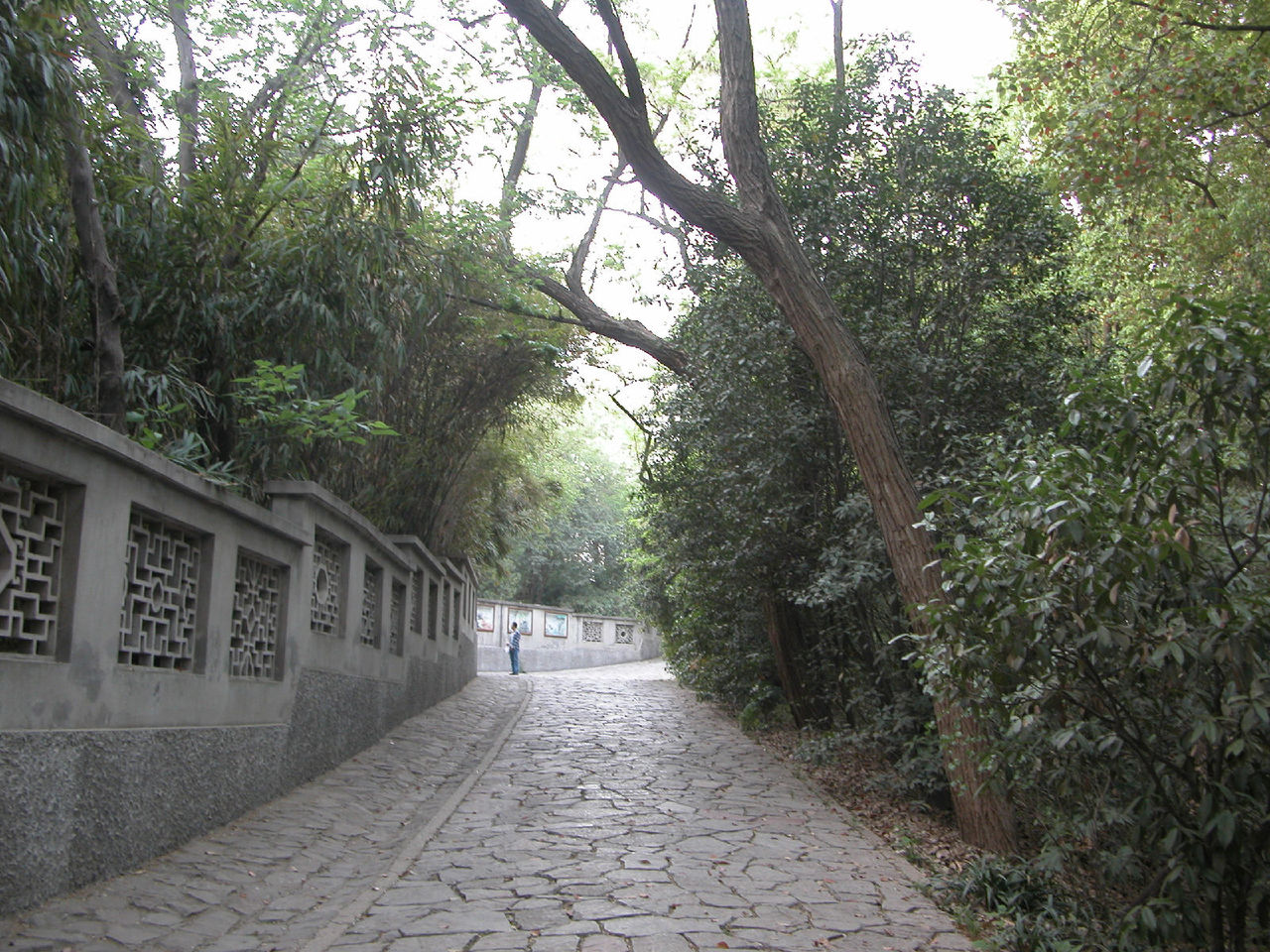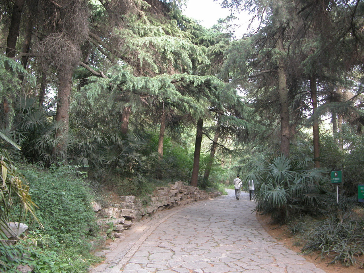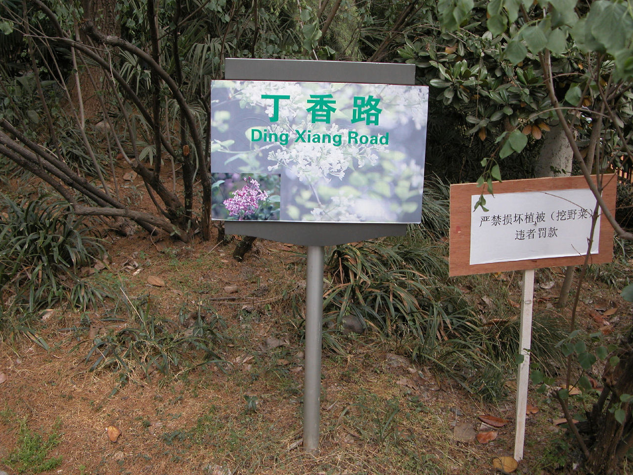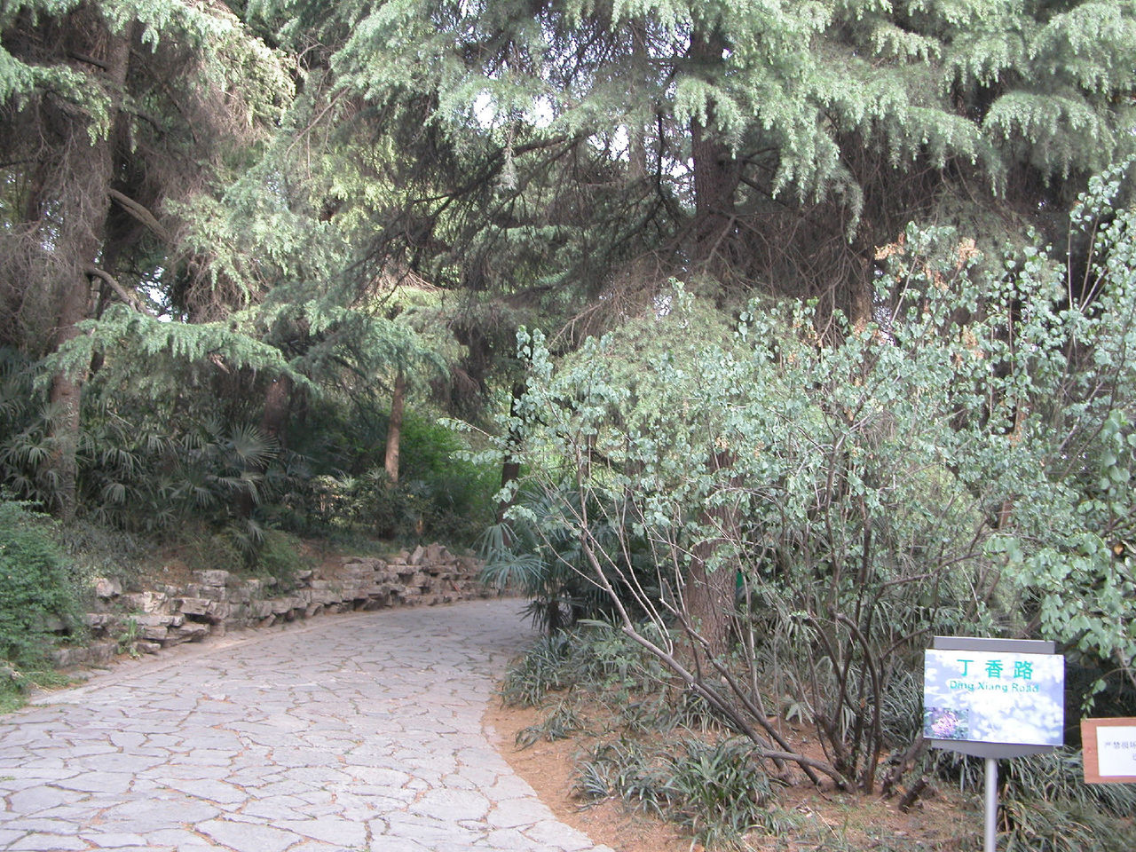 五一节下午到雨花台公园去。走到北大门时,发现既无售票处,也无看门人,于是随着众多游客进了北大门。先刭北大门广场南面的平台上瞻仰了烈士群雕像。然后走到园内东北部的名胜古迹区,沿着一条南北向的沥青大道(姑且称为东大道)向南行进,游历了雨花阁等名胜古迹。再向前走了一段,看见东大道右边(西边)有一个小亭子,亭里立着乾隆的一块御碑。看了御碑后,又走到东大道的另一边(东边),发现有一条小路,宽约三米,路面是用大大小小的花岗石块铺成的。小路口立有一块路牌,上面写着“丁香路”三个汉字,三个汉字下边写着英文“Ding Xing Roud”,路牌上还画着白丁香花作为背景,路牌左下角画了一个小矩形框,框内画着紫丁香花。从小路口向里望去,路两旁种着高约十几米至二十米的松树。往里走,即向东走,路面逐渐升高,而且小路弯弯曲曲,蜿蜒向上,越走越高,路左是围墙 ,路右是荆棘丛生的谷地。路两边的树也变成了高高的杉树、竹和其它乔木、灌木。走了一段后,路逐渐向北转湾。大约走了一百来米,到达曦园•生态孔雀园的后门口。这座山叫做东岗,又名梅岗、梅岭,从明初至今一直是南京赏梅胜地。这里的路东边竖有一块牌子,上面写着前面(北)有哪些景点,后面(南)有哪些景点。也许丁香路到此就结束了。这时朝四面看了看,没有看到丁香花。然后转身沿原路向山下走去,不时可听到曦园围墙内孔雀的叫声。路两边都没有丁香花,可能在半个月到一个月以前丁香花已开过了。回到丁香路起点,又仔细看了看丁香路牌和周围环境,发现路牌近处种了三株灌木,高的有五米高,矮的只有三米高,其叶子很像牌子上所画的丁香叶,估计这三株树就是丁香树。