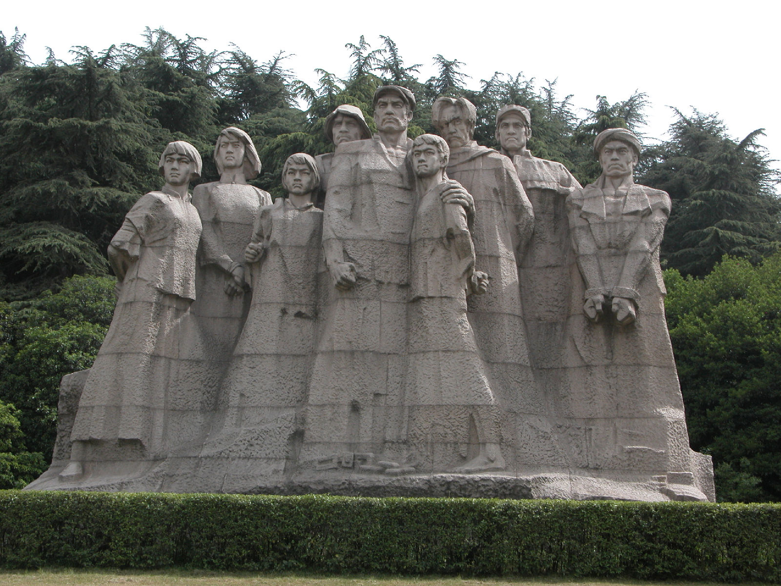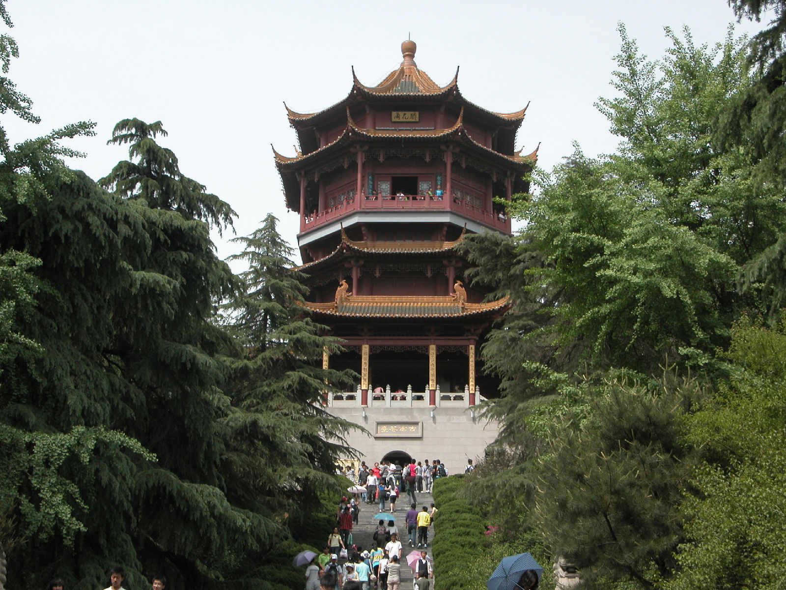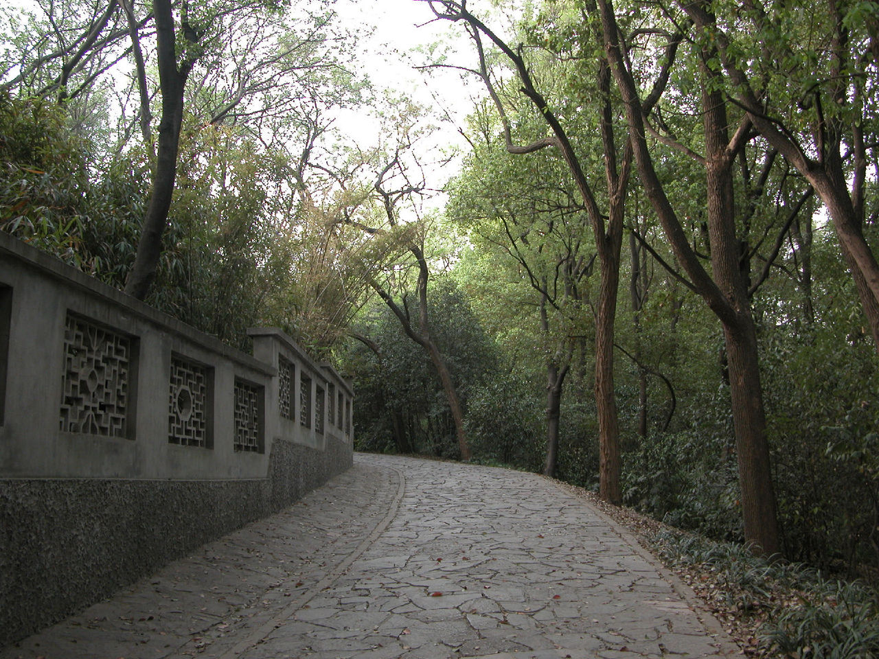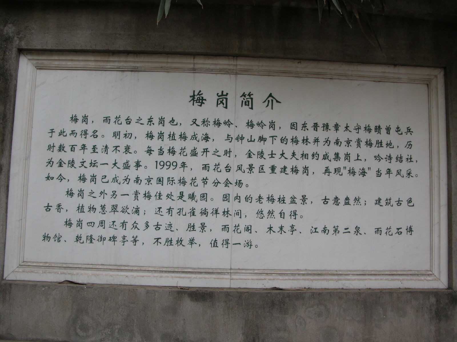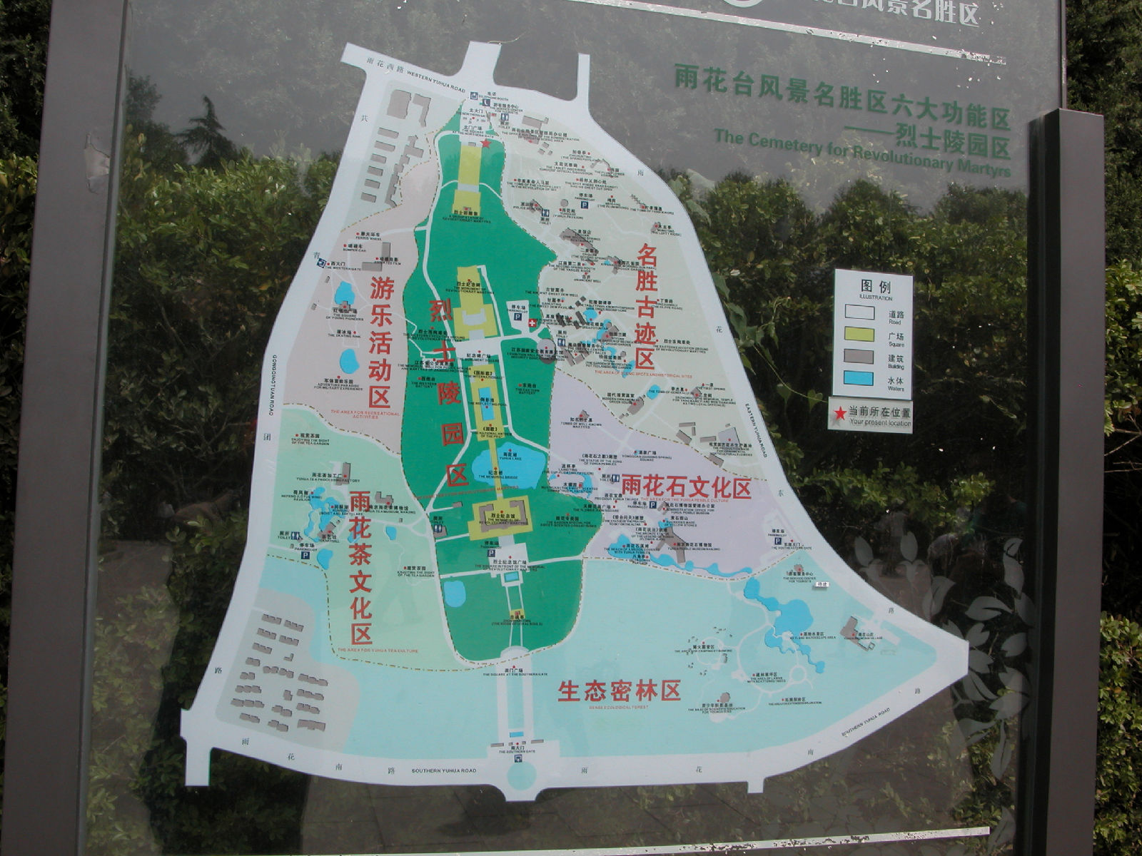 五一节下午到雨花台公园去。走到北大门时,发现既无售票处,也无看门人,于是随着众多游客进了北大门。先刭北大门广场南面的平台上瞻仰了烈士群雕像。然后走到园内东北部的名胜古迹区,沿着一条南北向的沥青大道(姑且称为东大道)向南行进,游历了雨花阁等名胜古迹。再向前走了一段,看见东大道右边(西边)有一个小亭子,亭里立着乾隆的一块御碑。看了御碑后,又走到东大道的另一边(东边),发现有一条小路,宽约三米,路面是用大大小小的花岗石块铺成的。小路口立有一块路牌,上面写着“丁香路”三个汉字,三个汉字下边写着英文“Ding Xing Roud”,路牌上还画着白丁香花作为背景,路牌左下角画了一个小矩形框,框内画着紫丁香花。从小路口向里望去,路两旁种着高约十几米至二十米的松树。往里走,即向东走,路面逐渐升高,而且小路弯弯曲曲,蜿蜒向上,越走越高,路左是围墙 ,路右是荆棘丛生的谷地。路两边的树也变成了高高的杉树、竹和其它乔木、灌木。走了一段后,路逐渐向北转湾。大约走了一百来米,到达曦园•生态孔雀园的后门口。这座山叫做东岗,又名梅岗、梅岭,从明初至今一直是南京赏梅胜地。这里的路东边竖有一块牌子,上面写着前面(北)有哪些景点,后面(南)有哪些景点。也许丁香路到此就结束了。这时朝四面看了看,没有看到丁香花。然后转身沿原路向山下走去,不时可听到曦园围墙内孔雀的叫声。路两边都没有丁香花,可能在半个月到一个月以前丁香花已开过了。回到丁香路起点,又仔细看了看丁香路牌和周围环境,发现路牌近处种了三株灌木,高的有五米高,矮的只有三米高,其叶子很像牌子上所画的丁香叶,估计这三株树就是丁香树。