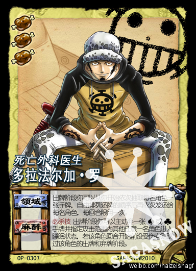 多拉法尔加•罗。绰号“死亡外科医生”,来自北海,悬赏金高达2亿贝利的超新星。罗是恶魔果实能力者,目前可以在他的战斗中看出他的能力是在某种范围内,进行自由的物体转换。在卡牌中罗的普通技是【领域】,在血量≤50%时触发必杀技【麻醉】。