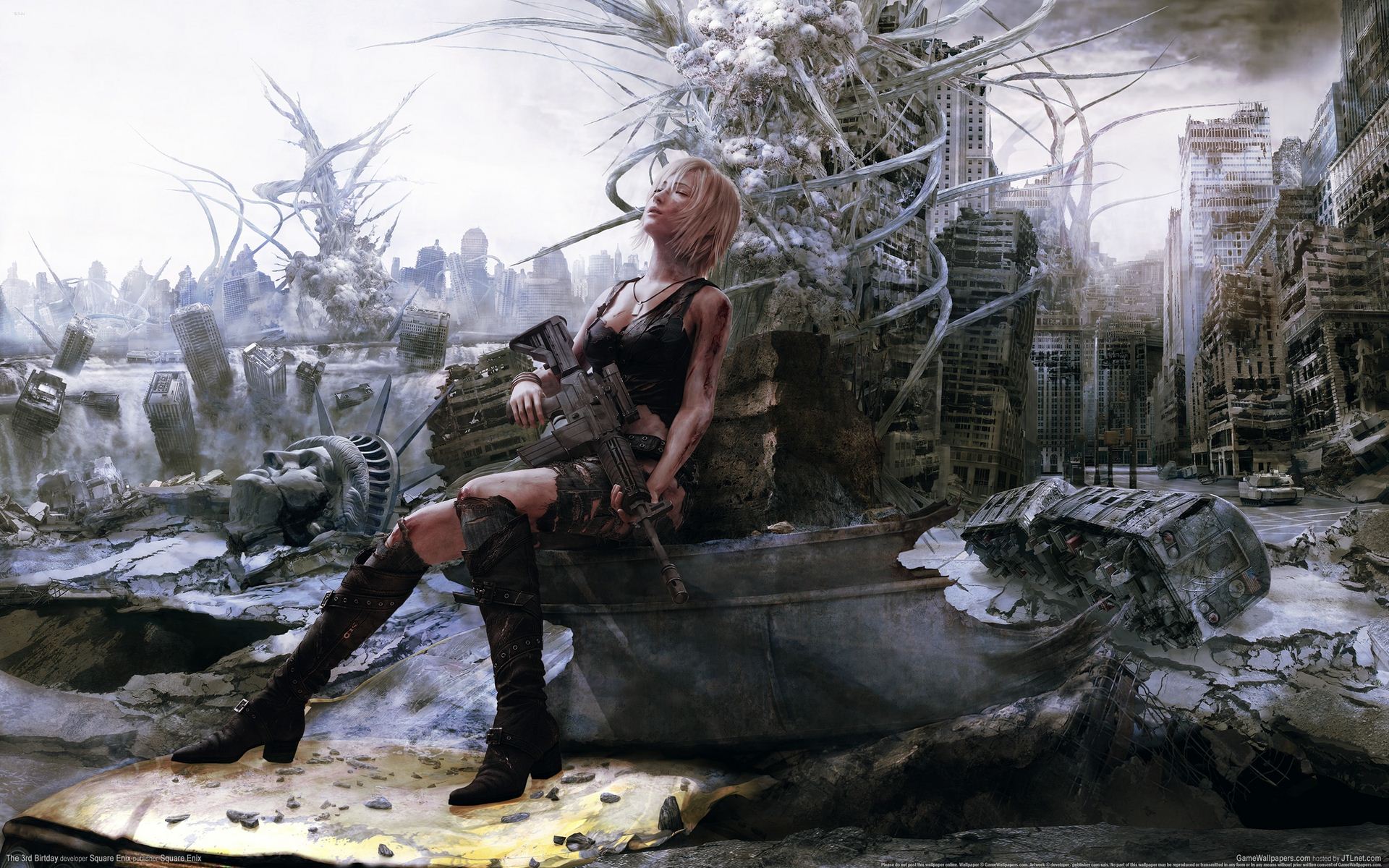 图片中 L姐 坐在石头上 很累的样子 手里 好像拿着武器 好像是抢