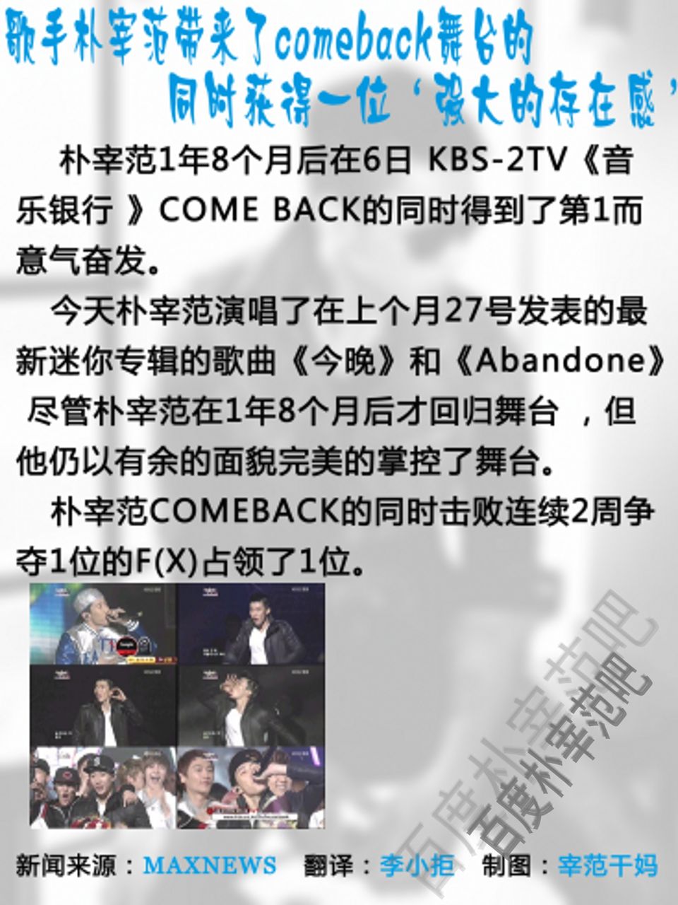 朴宰范1年8个月后在6日 KBS-2TV《音乐银行 》COME BACK的同时得到了第1而意气奋发。