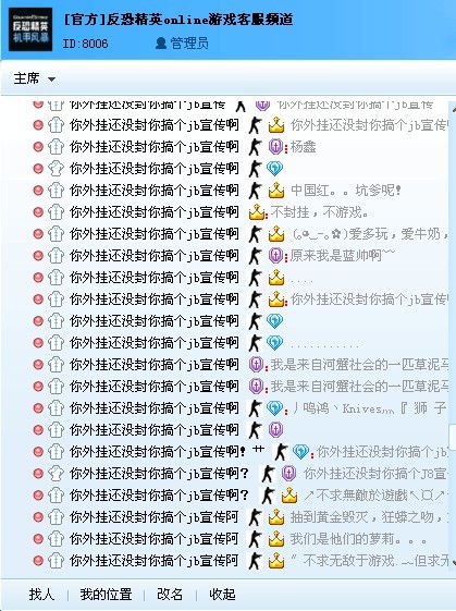 很没素质,什么样的人反G,穷b没钱玩,就滚,天成差你?还不封就不玩你跟谁说呢,妈的刷镰刀的时候一个个,挂哥挂哥的叫着,有病吧,一下午跟小孩是的在这喊,有用吗?告诉你们以前这种事发生n次,天成照样不管,好好玩得了,好好想想哪个游戏没挂,有这时间去打打游戏,不愿意玩的就滚,还新枪就踢?g你们能踢出去?闹了一下午有效果?好好想想吧