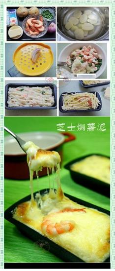 芝士焗薯泥,这种做法能让土豆在人们的心中重新树立“良好”形象。步骤1、土豆洗净去皮,切成片放锅中煮熟,压成土豆泥 2、洋葱用磨容器磨成茸备用 3、土豆泥里加入淡奶油,盐,黑椒粉,虾肉、青豆,和一点白糖充分拌匀 4、将混合的土豆泥装入烤盒内 5、将芝士条均匀的铺在上面,放入预热好的烤箱180度20分钟即可。想吃了吧……口水别流下来啊!