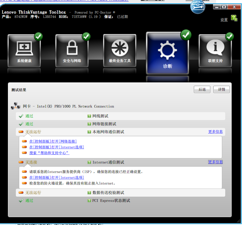 本人T60P,刚加了2GB内存,换了个系统。从XP换成Windows7旗舰版32位了。但是网卡用不了了。无线网卡可以用,有线的网络用不了。检测是本地连接,没有有效的IP地址。未修复。求高手。网卡驱动今儿刚从inter官方网站下载的。更新了。用联想检测工具检测如下图所示。求高手解答。