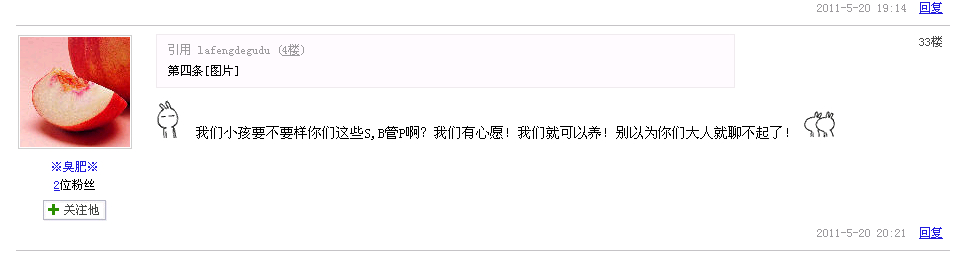 其中有一条说小孩子没经过家长允许就别养了,结果就有人就这条骂我,说他们小孩养SS不要我们这些SB管,别以为大人就了不起了,笑。