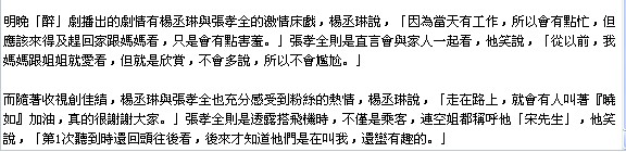 明晚「醉」剧播出的剧情有杨丞琳与张孝全的激情床戏,杨丞琳说,「因为当天有工作,所以会有点忙,但应该来得及赶回家跟妈妈看,只是会有点害羞。」张孝全则是直言会与家人一起看,他笑说,「从以前,我妈妈跟姐姐就爱看,但就是欣赏,不会多说,所以不会尴尬。」