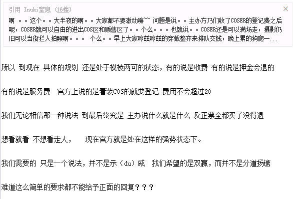 个么。。。这个二次排队登记付费退款。。有必要么。主办要投入更多人力物力,COSER也要投入更多精力体力,对挖。。何必呢。。。何苦呢。。。。。