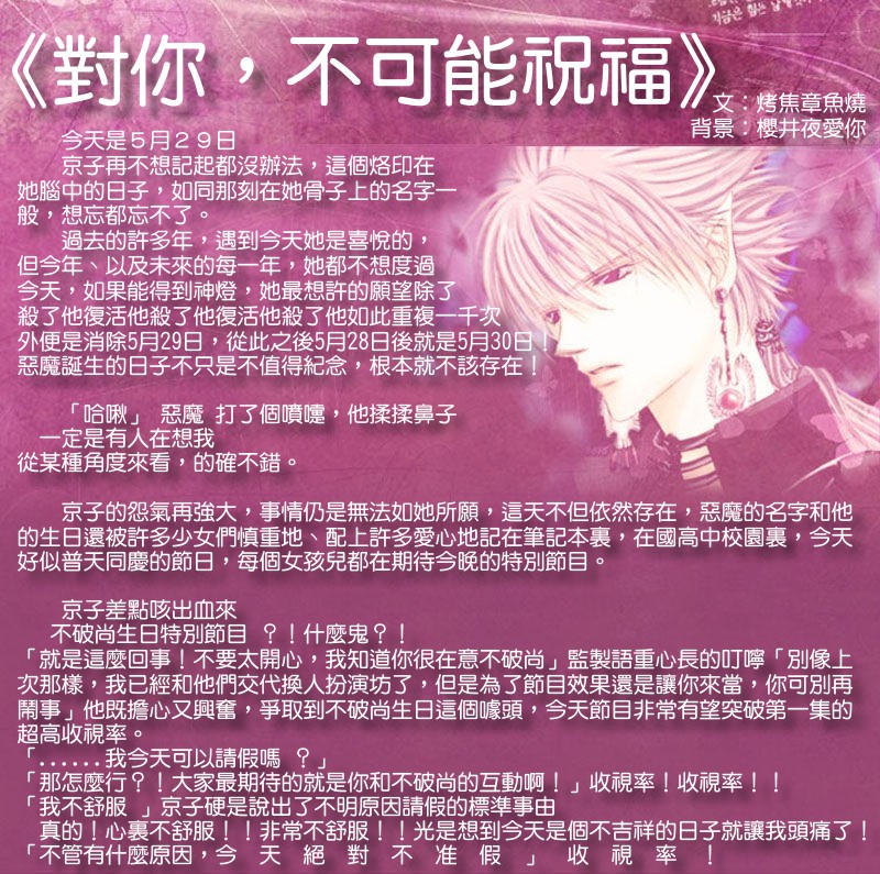 她在心里呐喊著:「为什麼今天不能请假!为什麼那家伙今天要来上节目!为什麼他要诞生!」怨著怨著她已走到了目的地 - “不破尚休息室”,今日的门牌看来异常得刺眼 「为什麼要我来接他!!」
