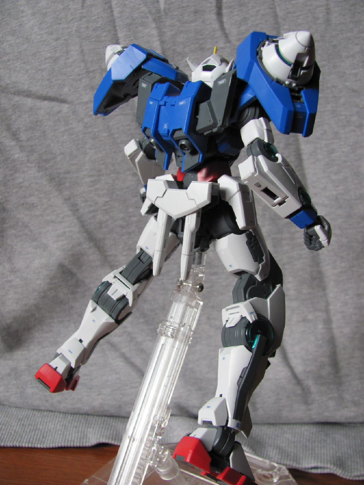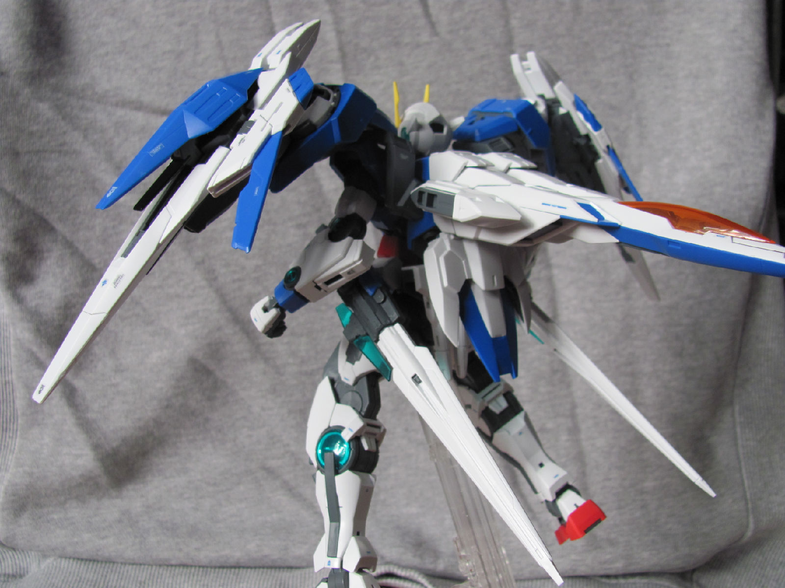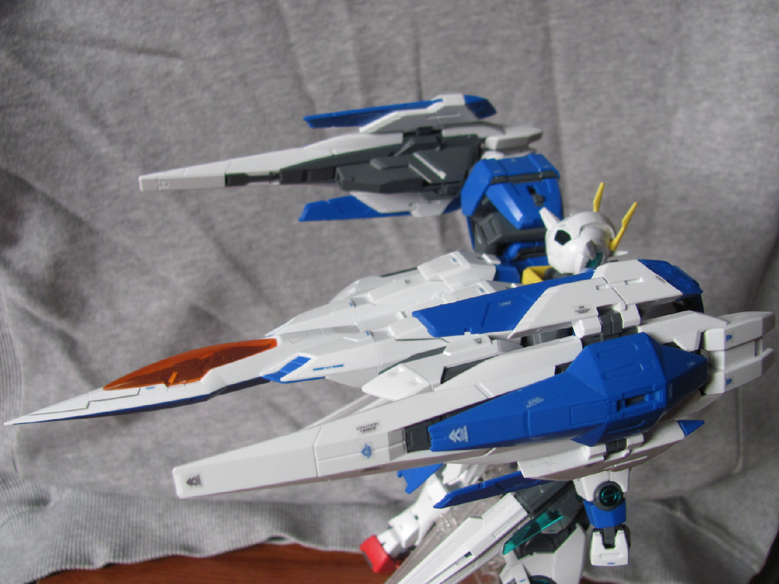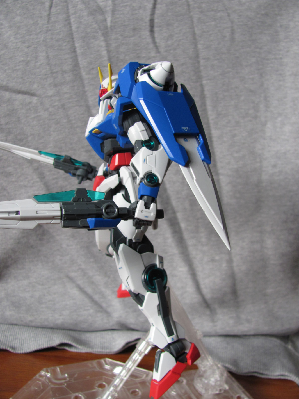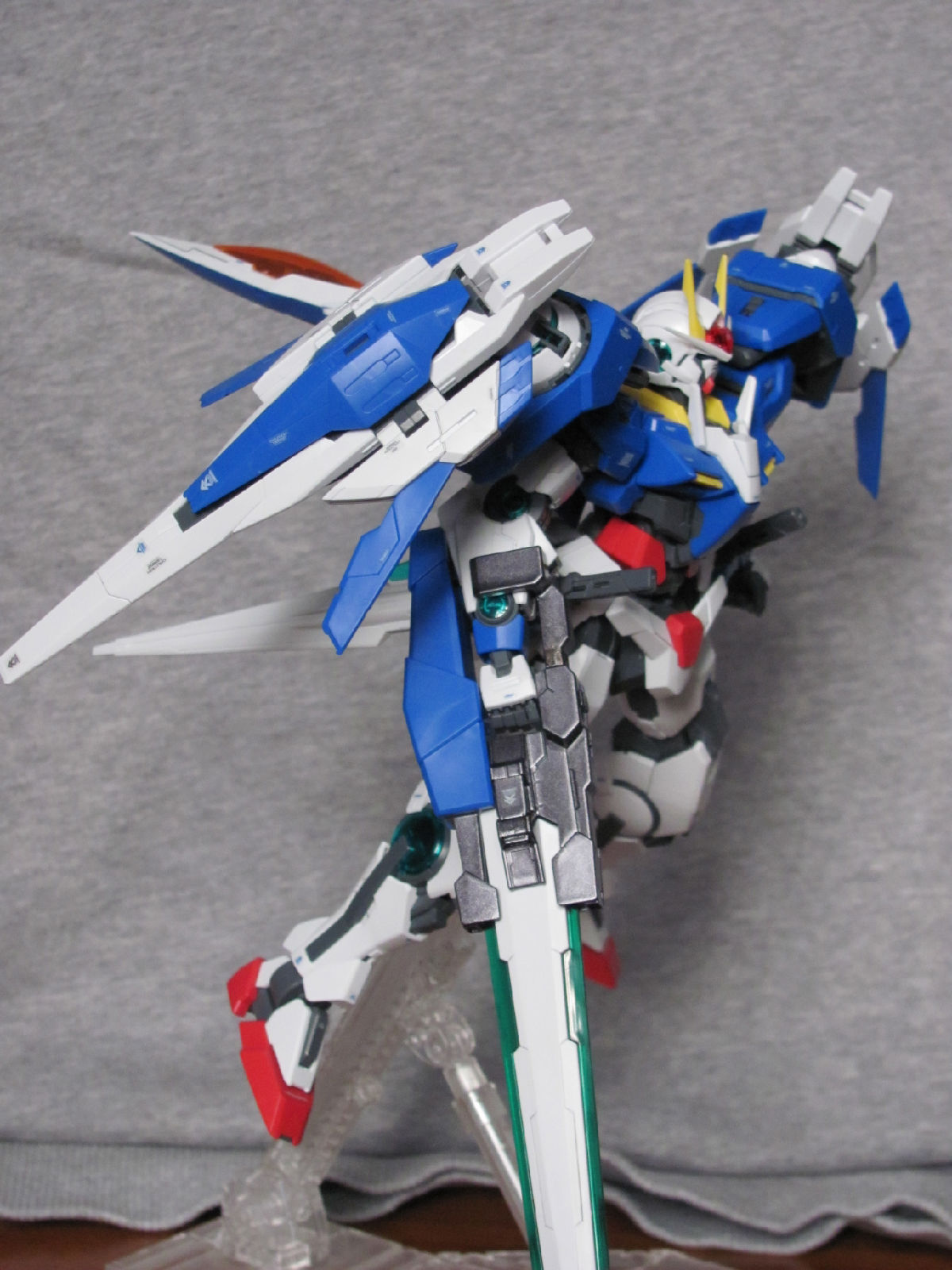 3,跨部沿袭了EXIA的关节,使用滑动机关来使腿部可动范围变大,而且很好的还原了屁股后面两支GN SABER的可动,设计还是比较成功的。 评分:85
