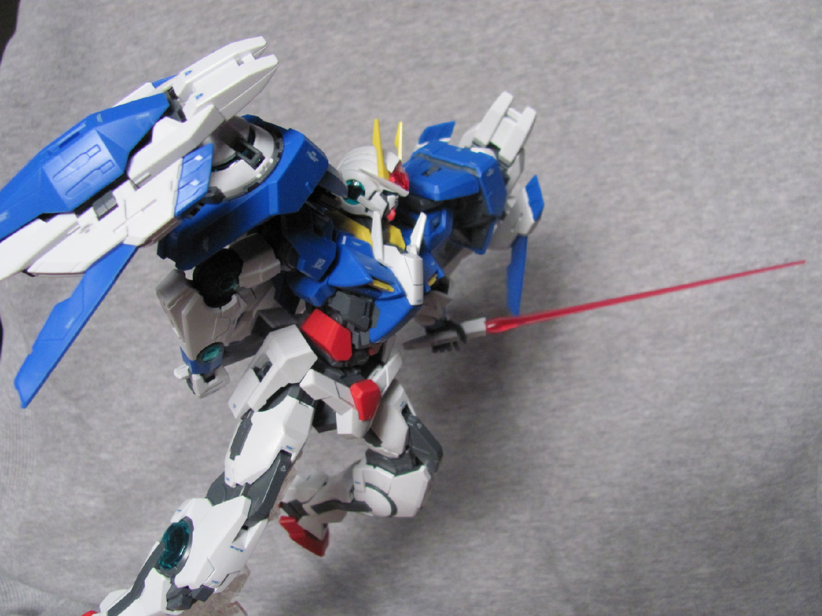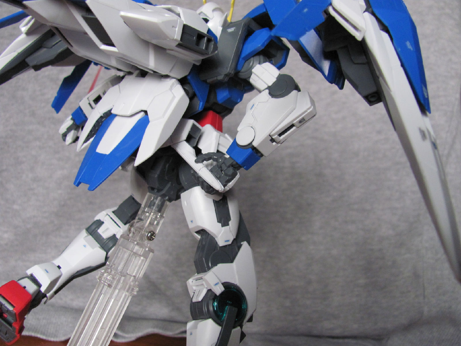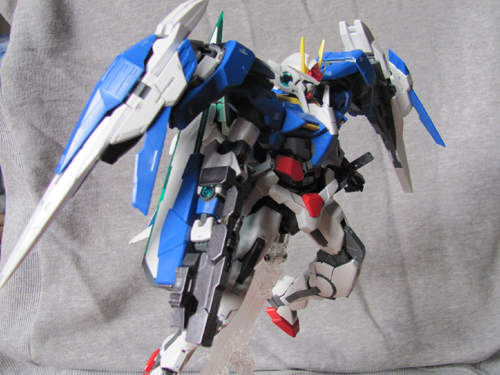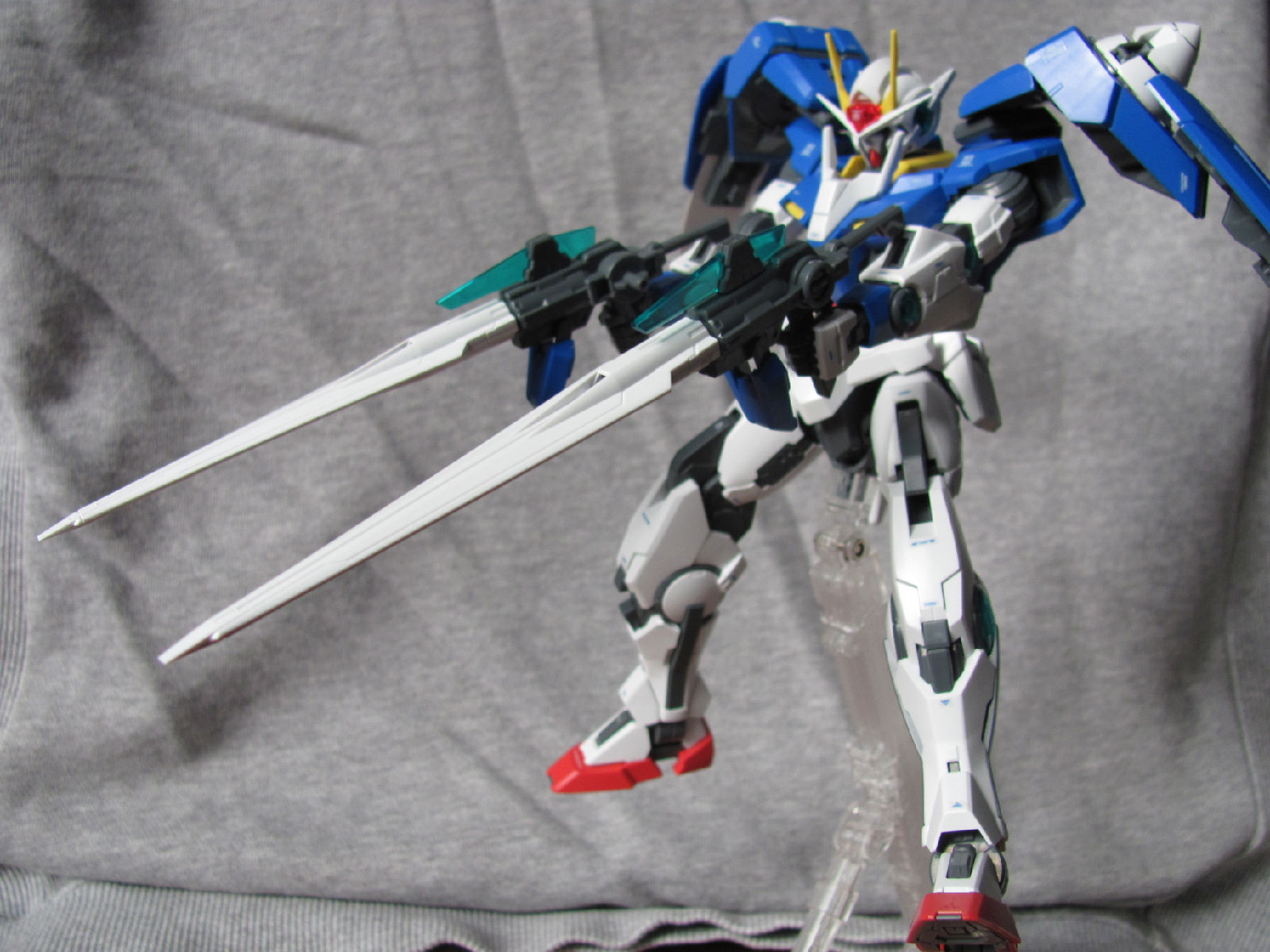 3,跨部沿袭了EXIA的关节,使用滑动机关来使腿部可动范围变大,而且很好的还原了屁股后面两支GN SABER的可动,设计还是比较成功的。 评分:85