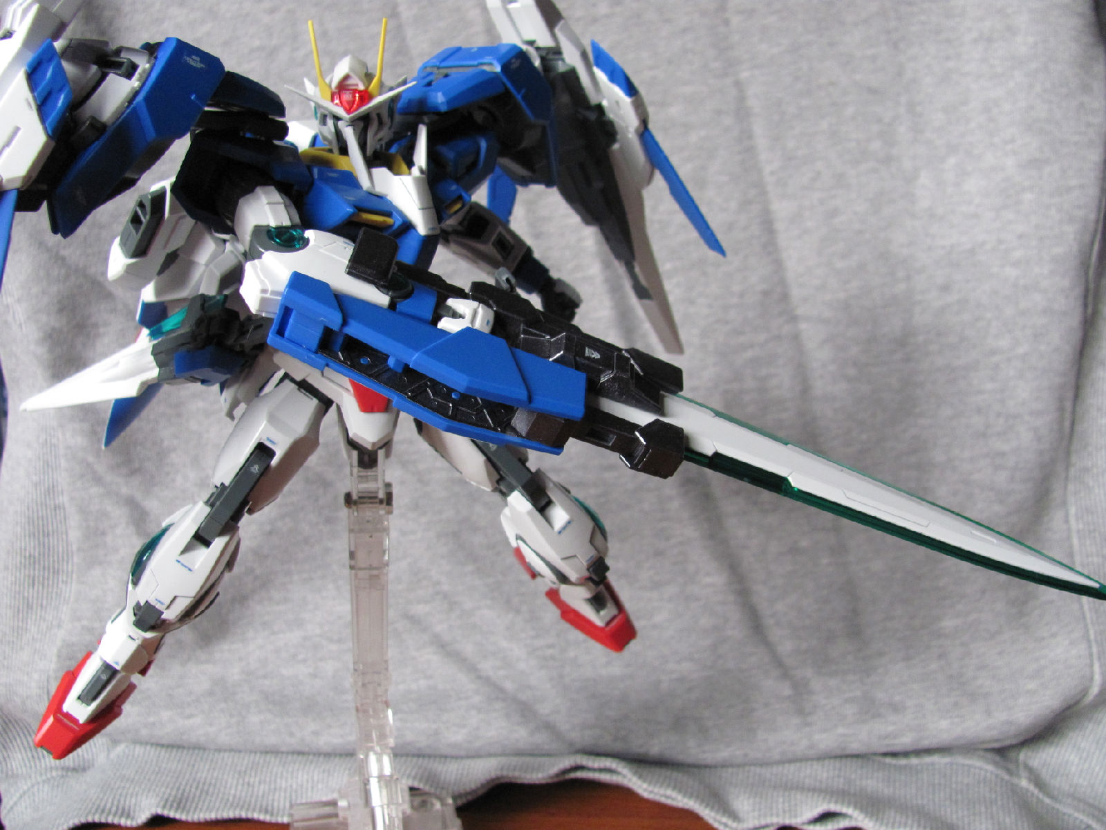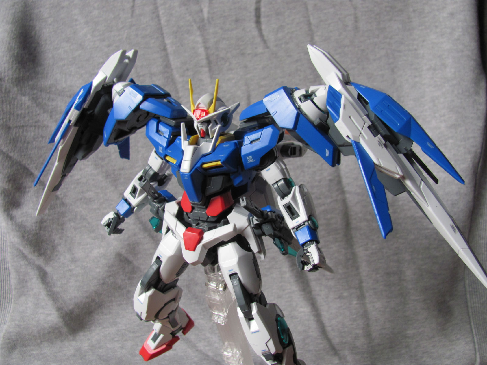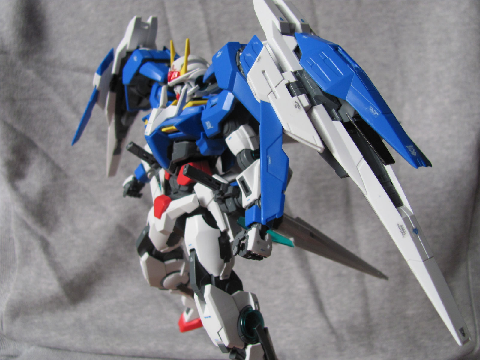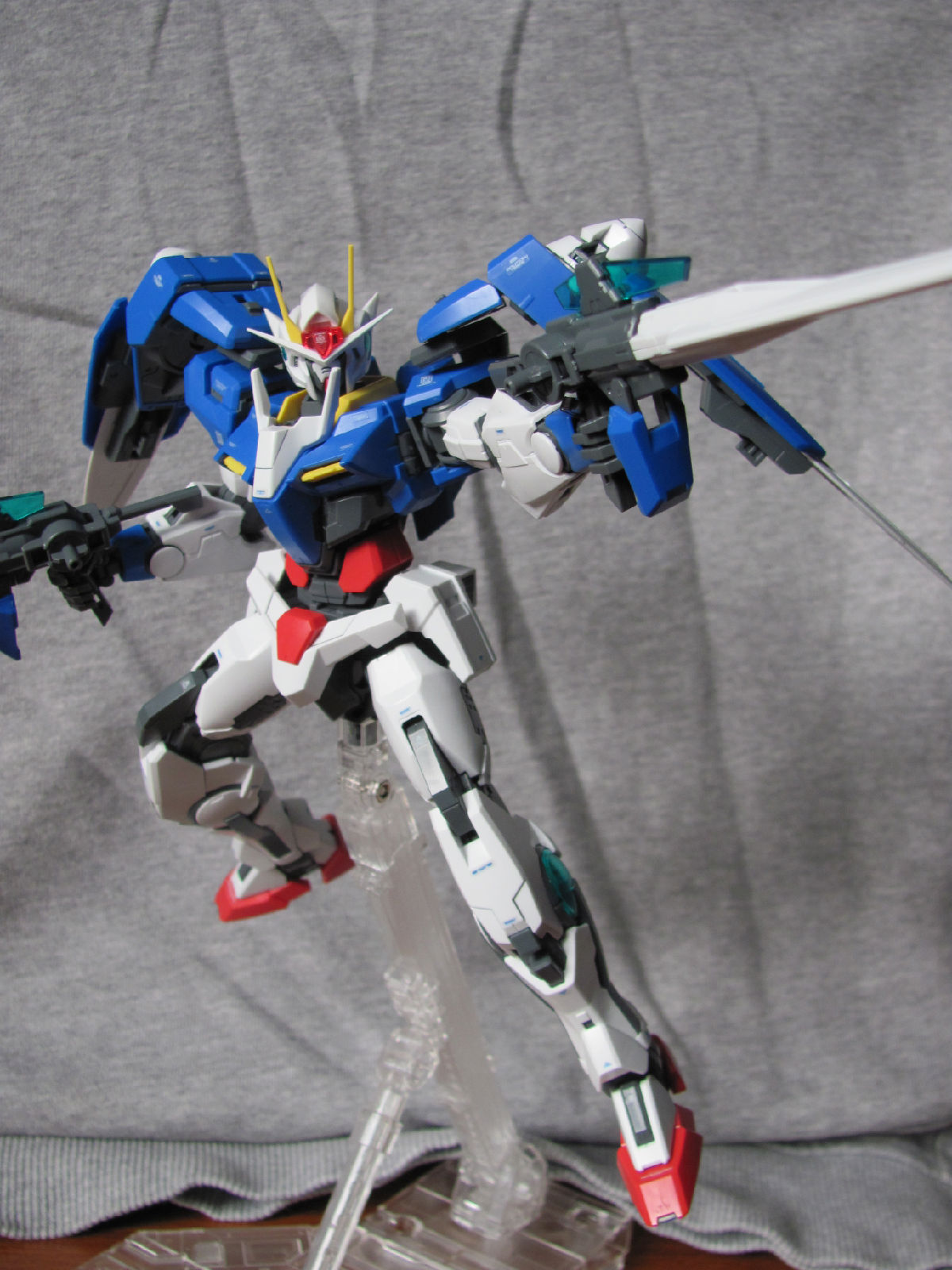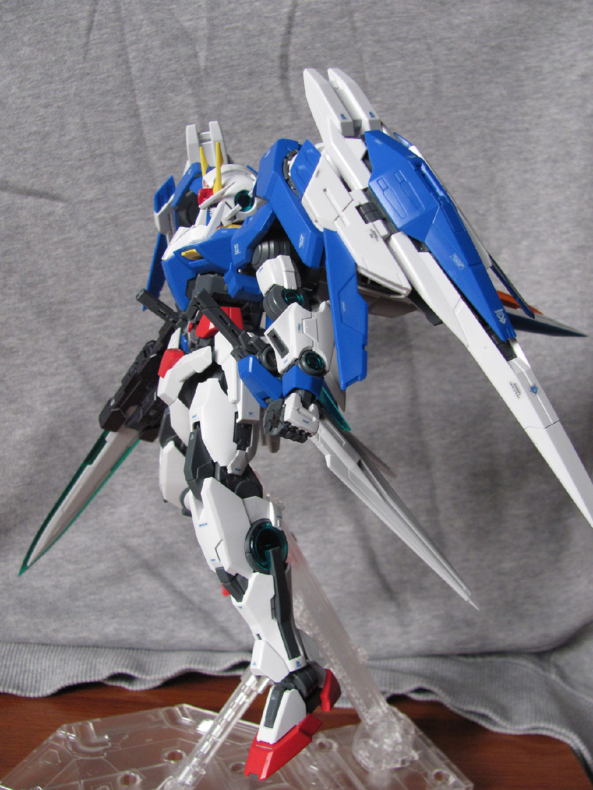 3,跨部沿袭了EXIA的关节,使用滑动机关来使腿部可动范围变大,而且很好的还原了屁股后面两支GN SABER的可动,设计还是比较成功的。 评分:85