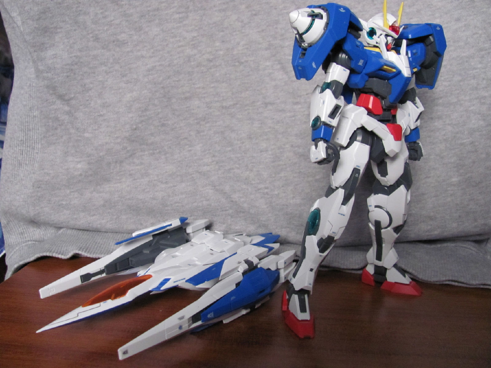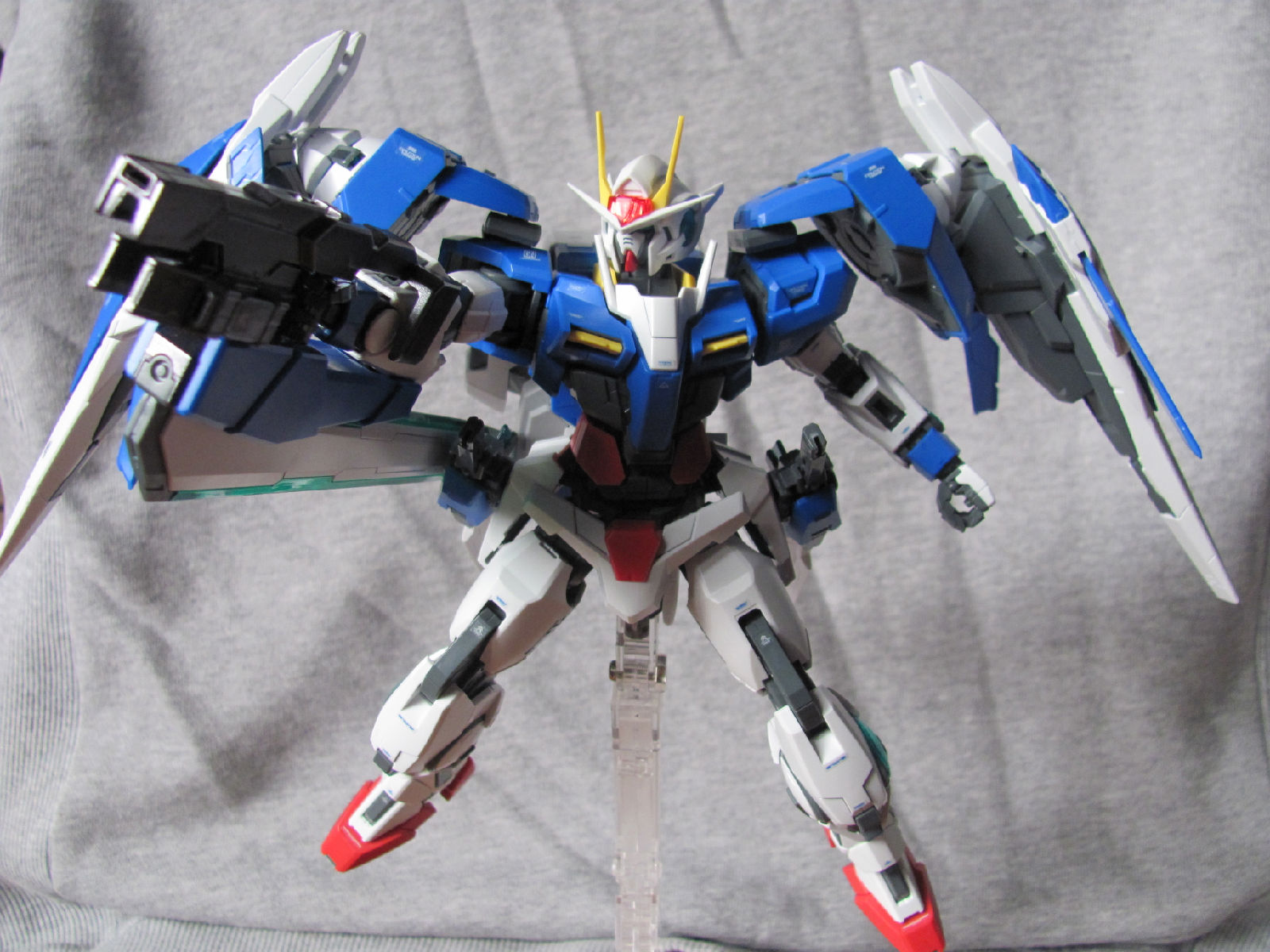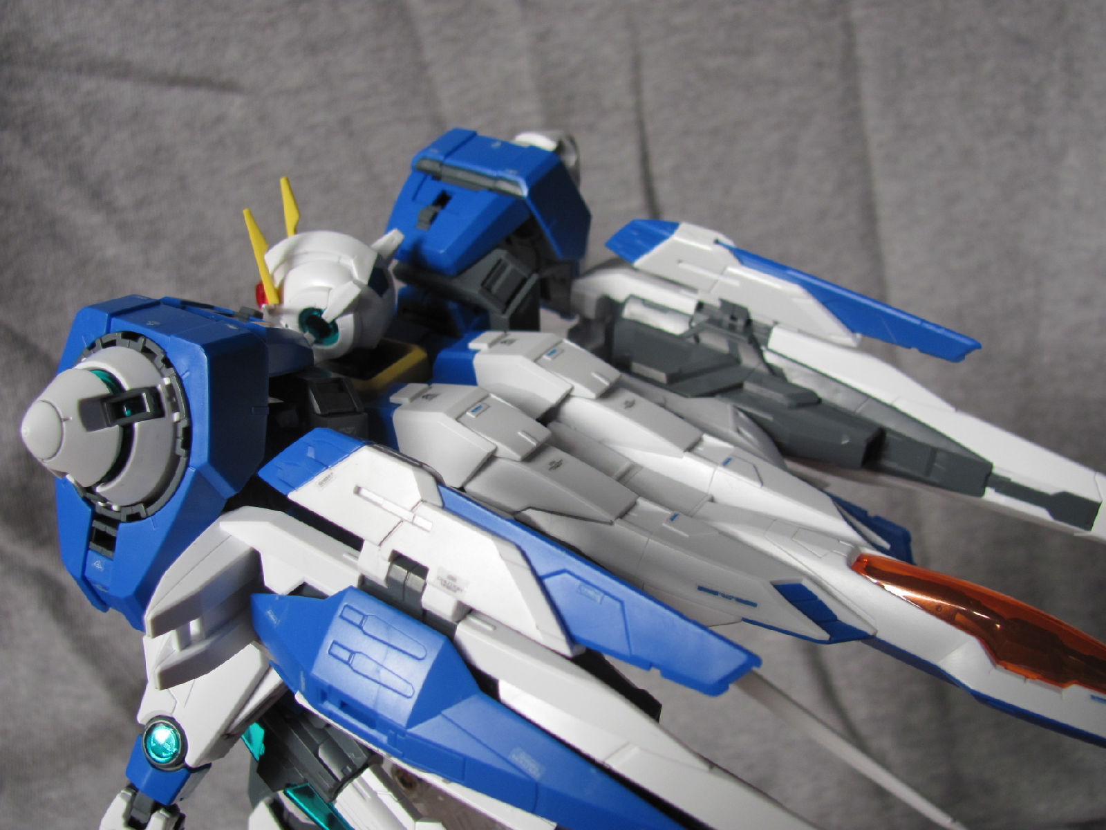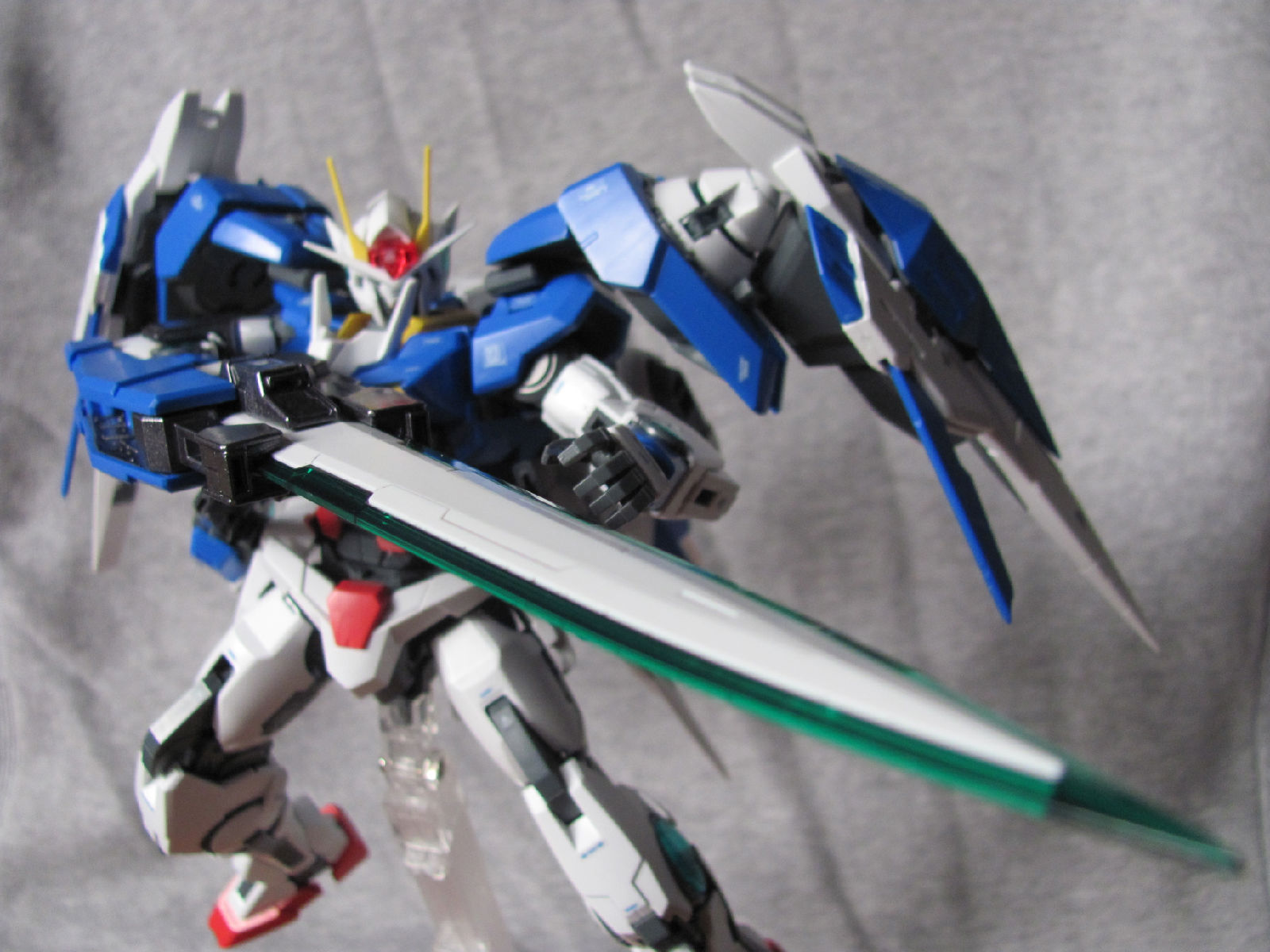 3,跨部沿袭了EXIA的关节,使用滑动机关来使腿部可动范围变大,而且很好的还原了屁股后面两支GN SABER的可动,设计还是比较成功的。 评分:85