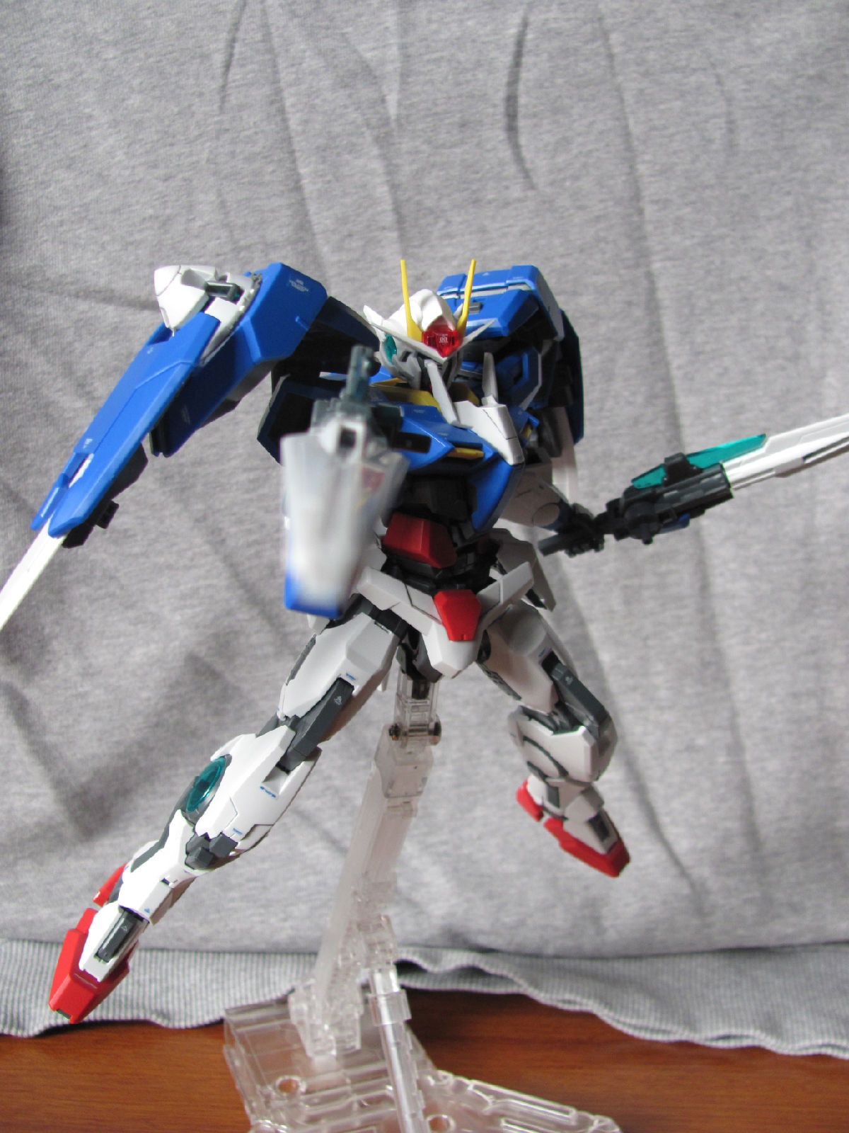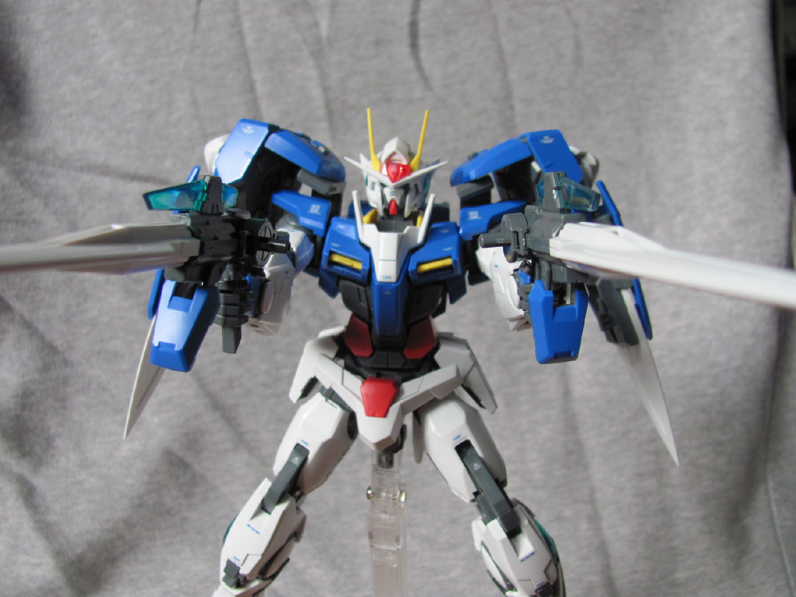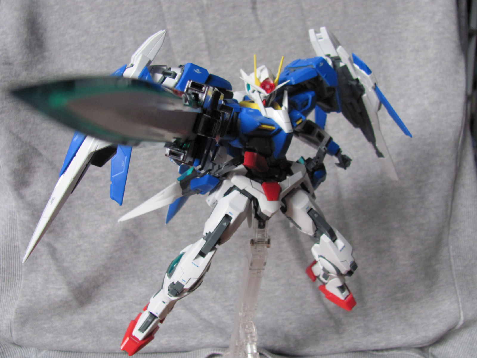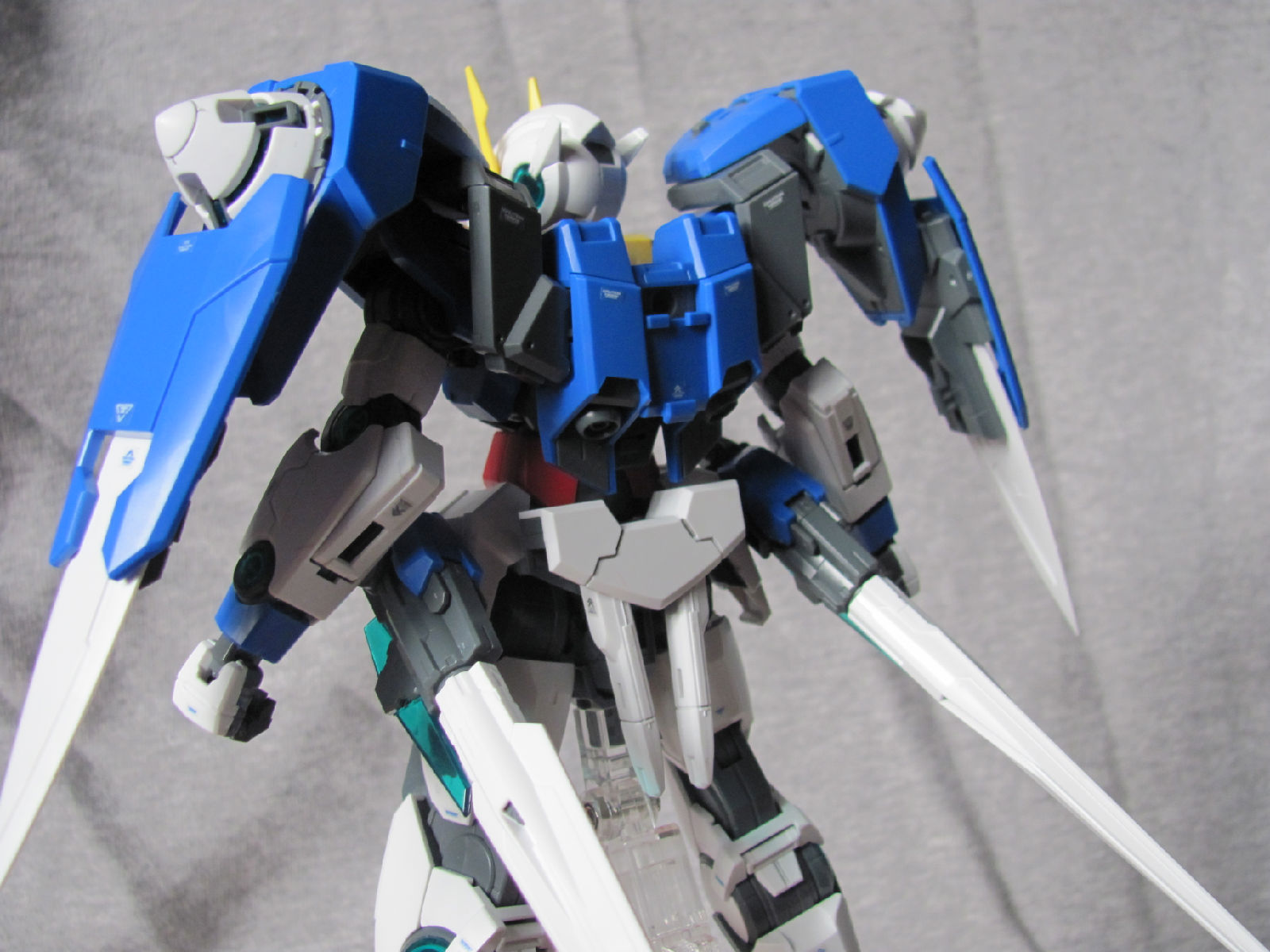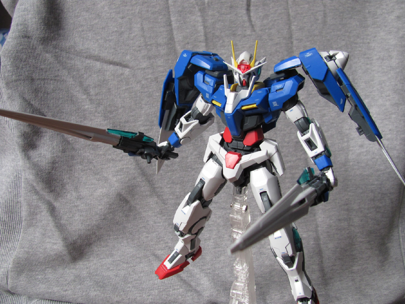 3,跨部沿袭了EXIA的关节,使用滑动机关来使腿部可动范围变大,而且很好的还原了屁股后面两支GN SABER的可动,设计还是比较成功的。 评分:85