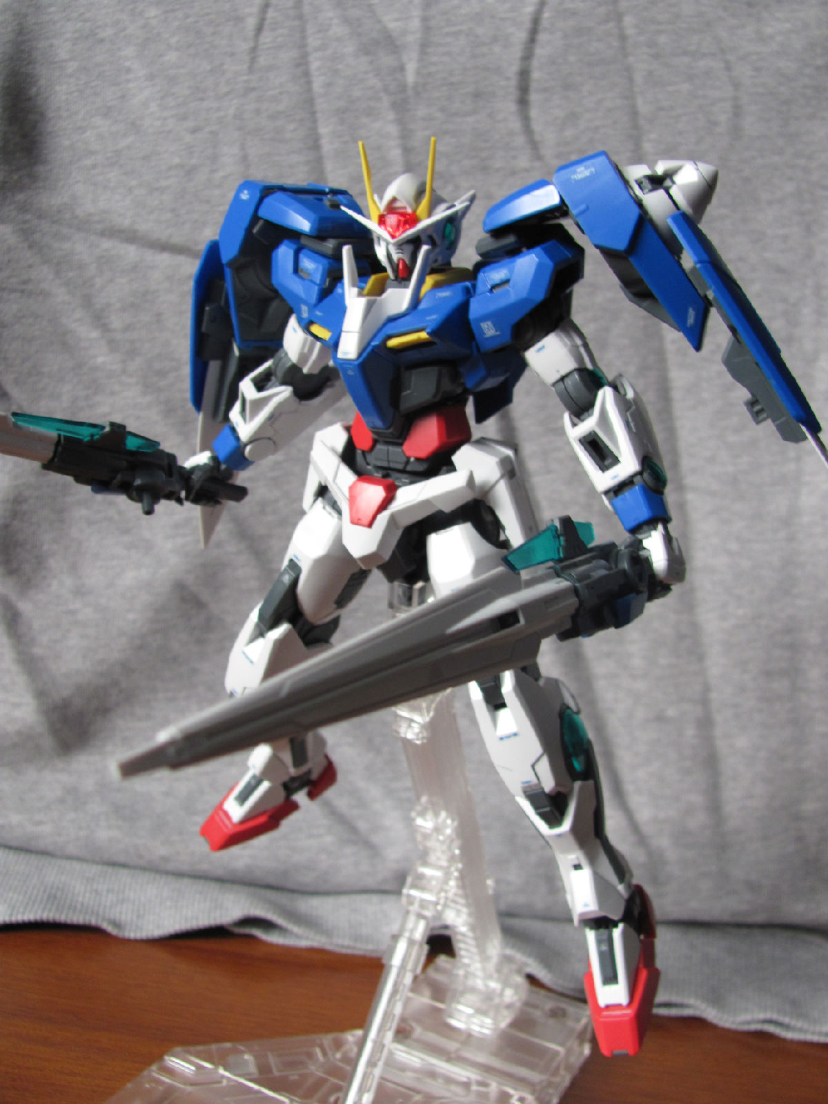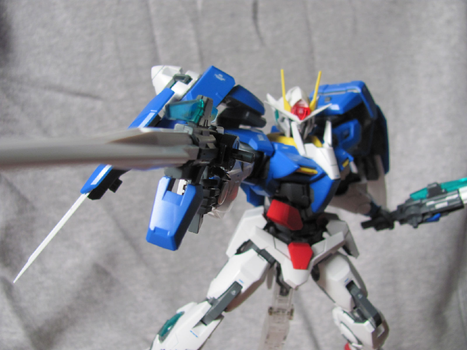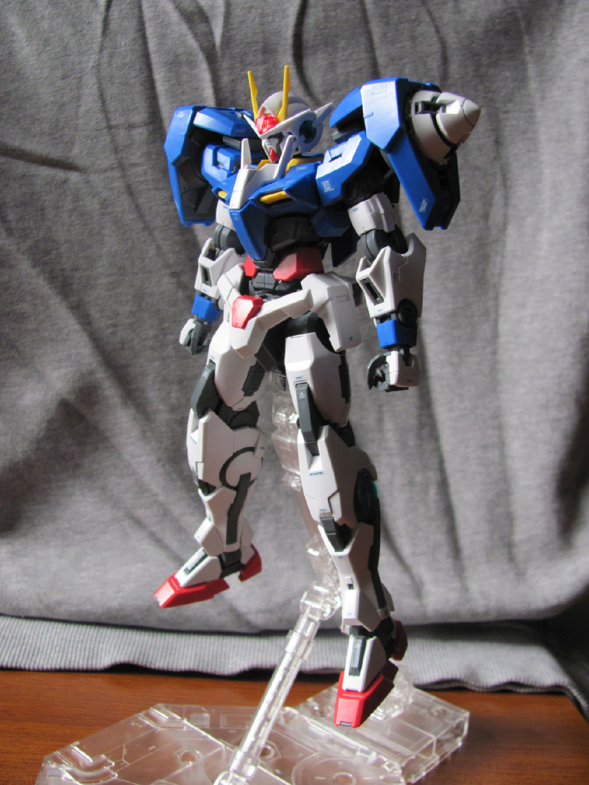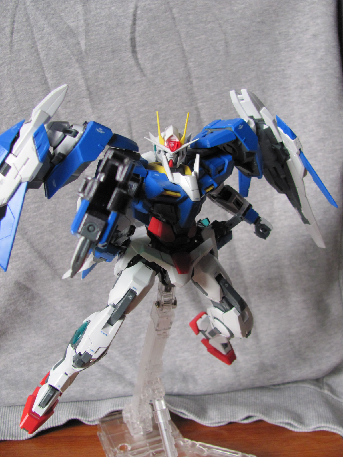 3,跨部沿袭了EXIA的关节,使用滑动机关来使腿部可动范围变大,而且很好的还原了屁股后面两支GN SABER的可动,设计还是比较成功的。 评分:85