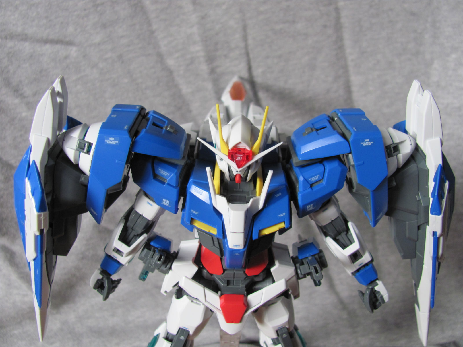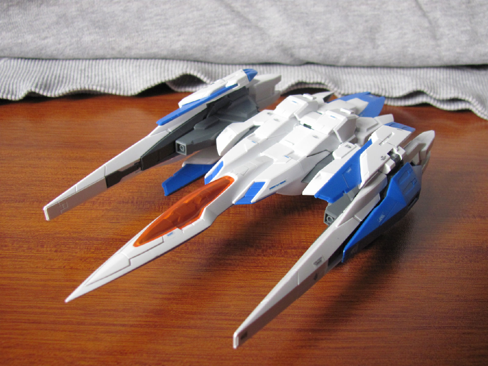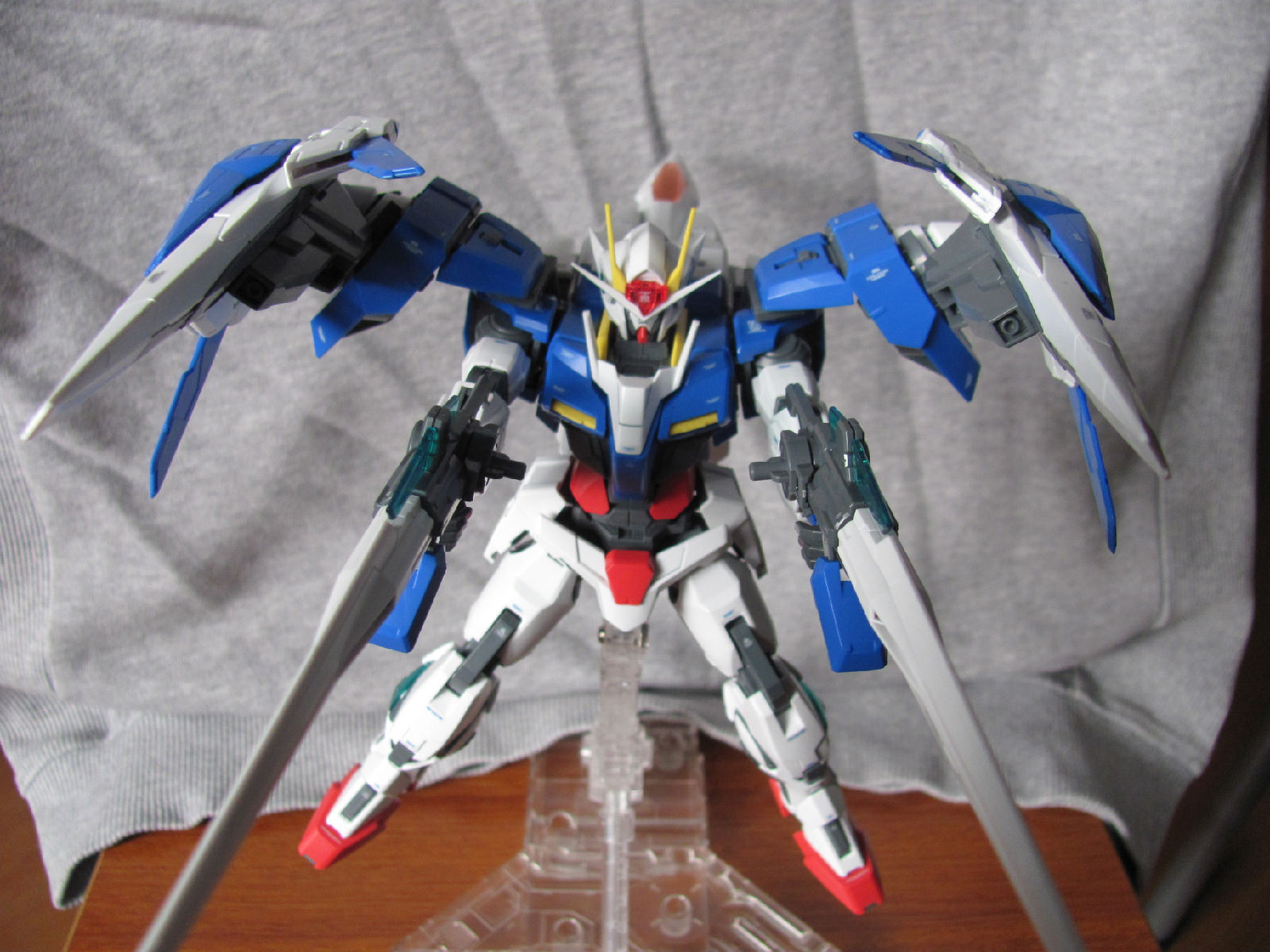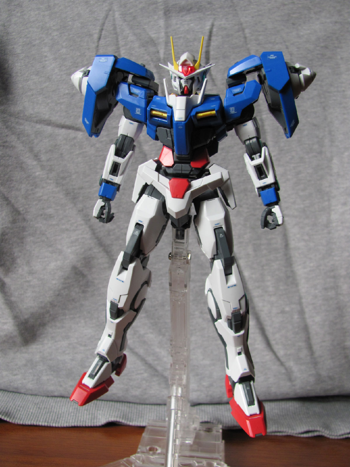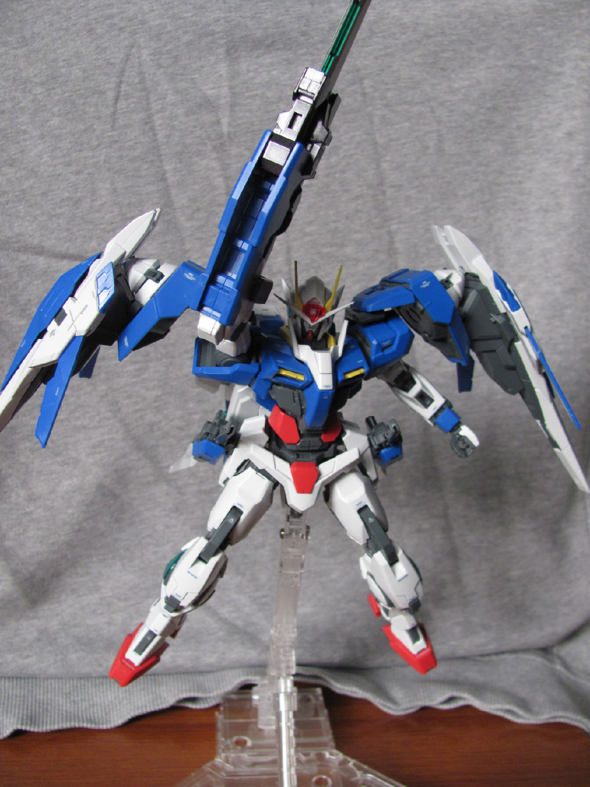 3,跨部沿袭了EXIA的关节,使用滑动机关来使腿部可动范围变大,而且很好的还原了屁股后面两支GN SABER的可动,设计还是比较成功的。 评分:85