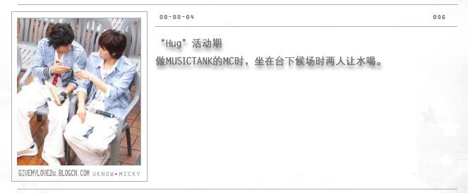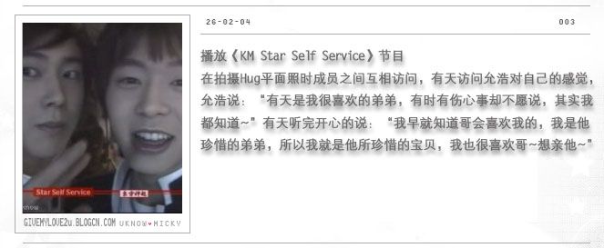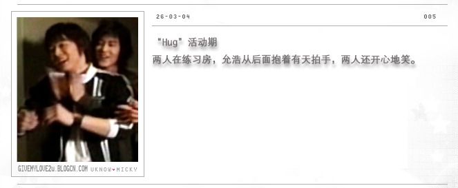 在拍摄HUG平面照时成员之间互相访问, 有天访问允浩对自己的感觉,允浩说:“有天是我很喜欢的弟弟,有时有伤心事却不愿说,其实我都知道~”