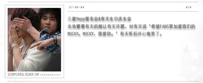 允浩蒙着有天的眼让有天许愿,对有天说“希望FANS更加爱我们的MICK。MICK,我爱你。”