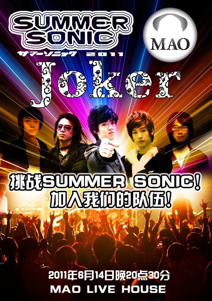 2011年东京SUMMER SONIC中国乐队选拔赛18支劲旅之一Joker乐队是由中韩两国的XFAN组成的乐队,两年的时间已经成长为一支具有自己独立的风格,成熟的创作,华丽的现场表现的优秀乐队。虽然Joker已经完全具备了独立的创作能力,拥有了自己的fans群体,但他们仍然没有遗忘曾经点燃他们的梦想,给他们激情和动力X JAPAN,两年间陆续参加多场与X有关的纪念演出,并已经慢慢成为了北京乃至中国XFAN的代表。而今年,一个千载难逢的机会让Joker再次热情高涨!那就是2011 SUMMER SONIC音乐节,与X同台的机会,也许此生只有这一次,代表中国的XFAN去到东京现场与X同台!向X致敬!