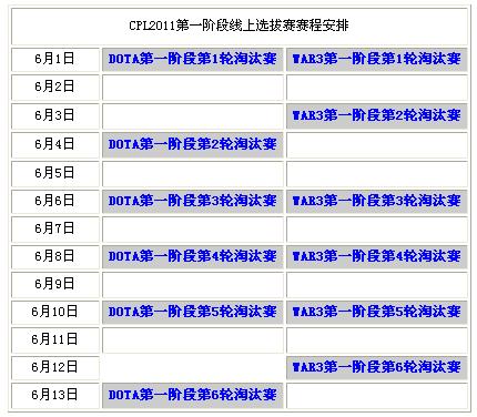沉寂三年的昔日全球第一大电子竞技赛事CPL已经正式回到广大电竞玩家身边,CPL2011电子竞技超级明星国际邀请赛将于8月举行,本次大赛的比赛项目是国内最火爆的Dota和War3。第一阶段线上预选赛也将于6月1日正式在VS竞技游戏平台打响,决出4支Dota战队和4名War3选手晋级CPL2011国际明星邀请赛决赛。以下是线上选拔赛赛程安排:
