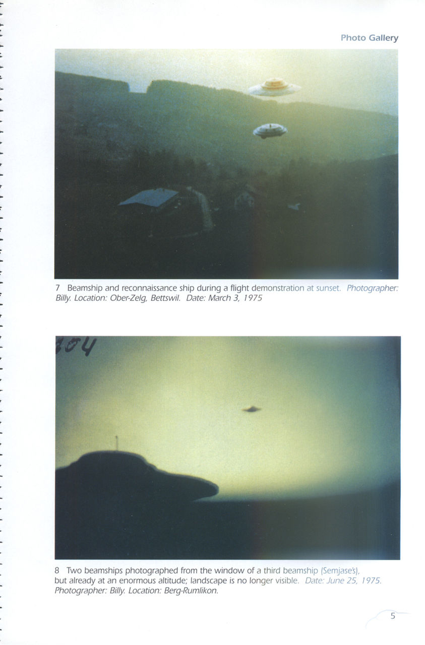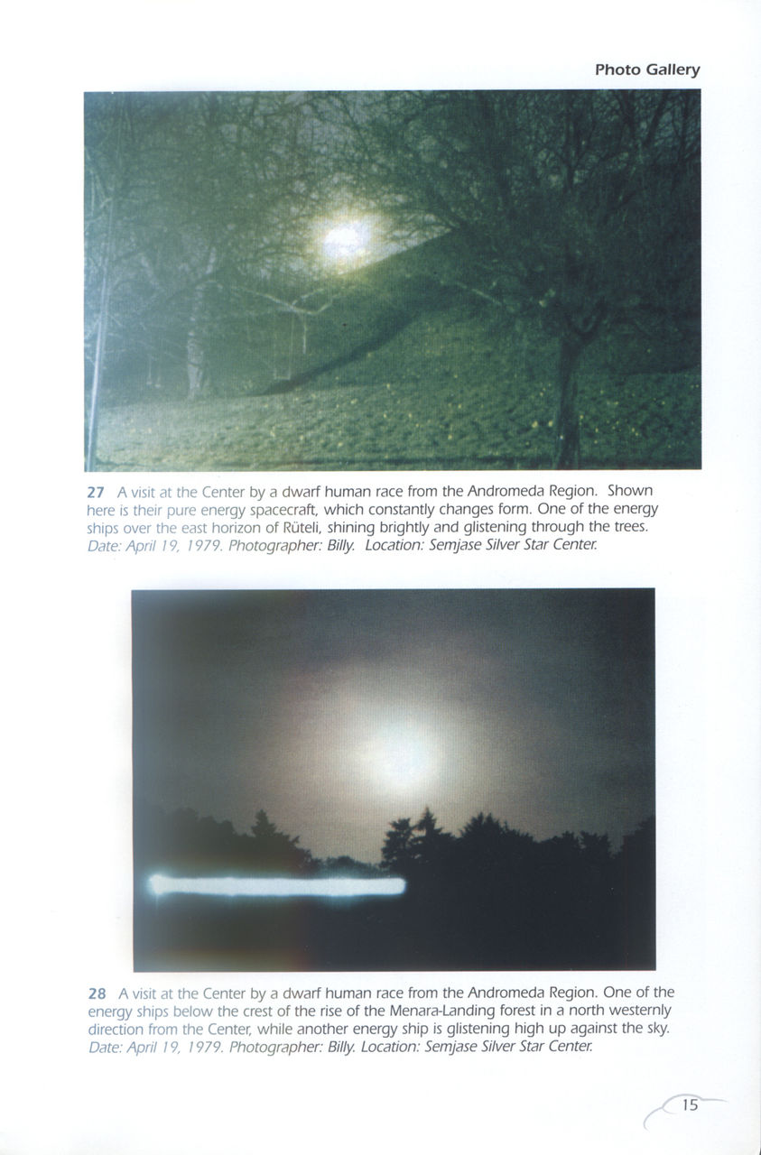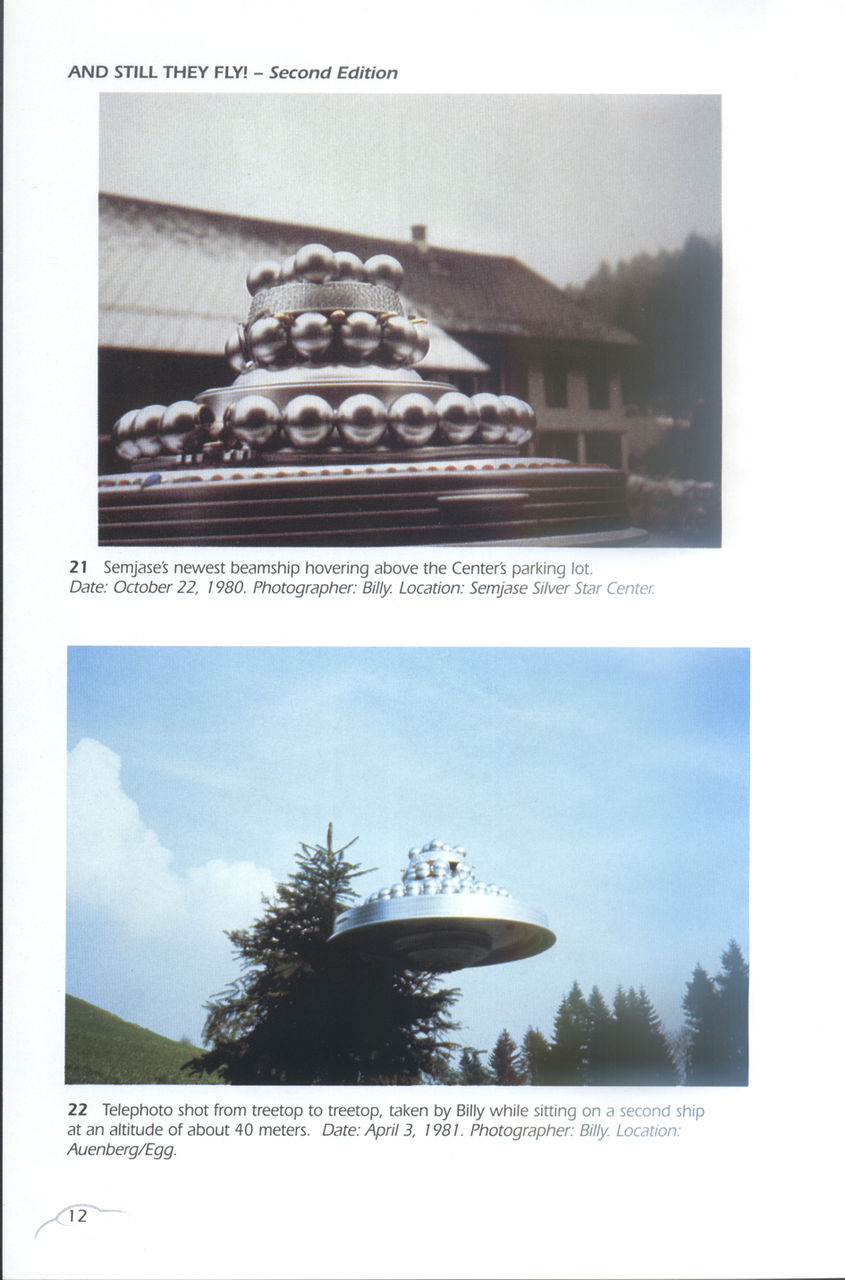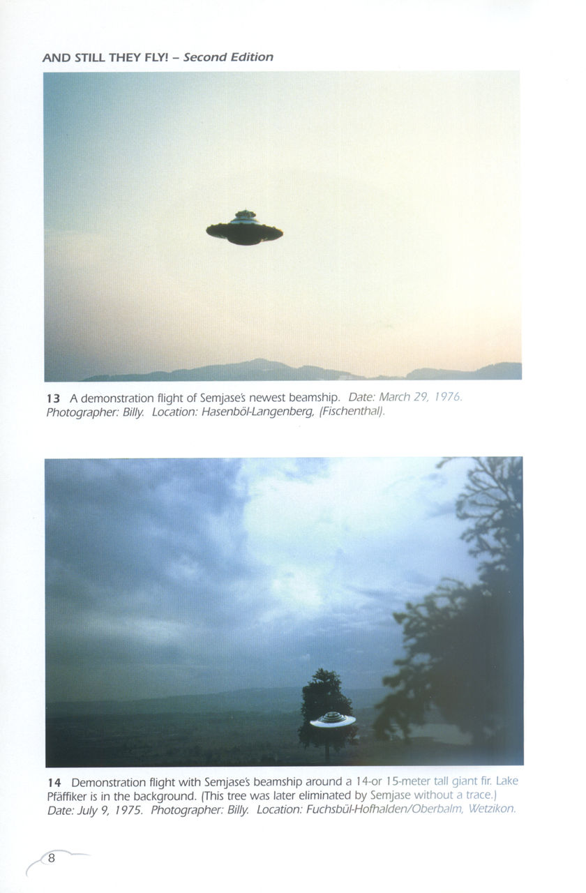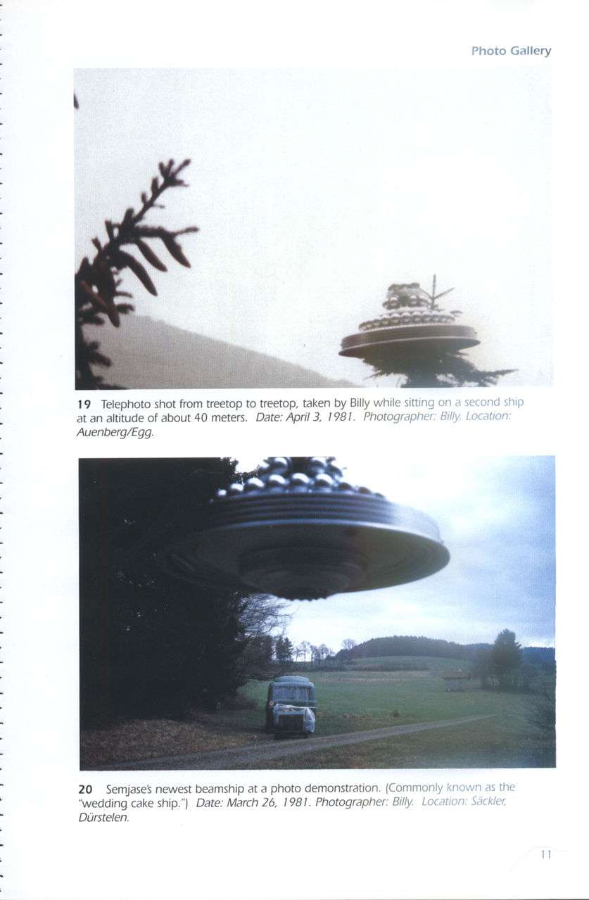 第二张图,飞碟在树前面,树的大小和飞碟实际大小,有脑子的就能想出来。这如果不是比利扔出的一个用于拍摄的模型,那就是小人国来的外星人