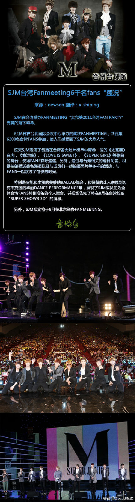 @音悦台SuJu饭团:ˇ☆SJ-Mˇ≮11.06.08新闻≯:SJM台湾Fanmeeting6千名fans“盛况” 【SJM在台湾举办fanmeeting“太完美2011台湾FAN PARTY”完美的落下帷幕。与fans一起渡过了愉快的时光。并现场告知了将在8月在台湾放映“Super Show3 3D”的消息。另外,SJM预定将于8月在北京举办fanmeeting。】