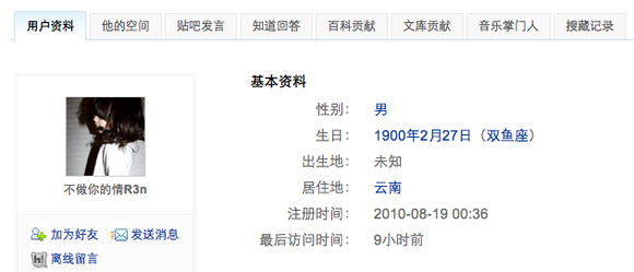 该同学滴资料。。。貌似不是新马甲。。唉!同学你乃大意了啊!万一这个帐号被人肉出来肿么办啊!!