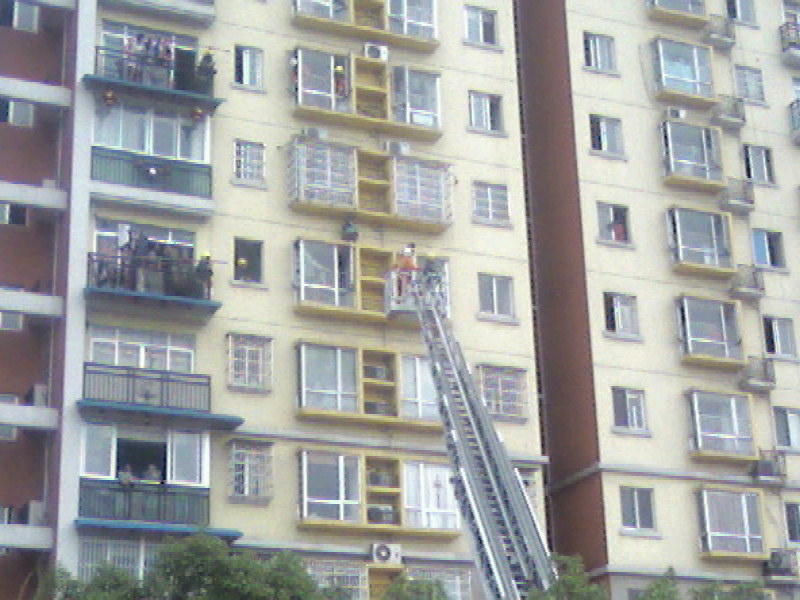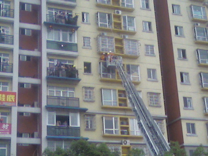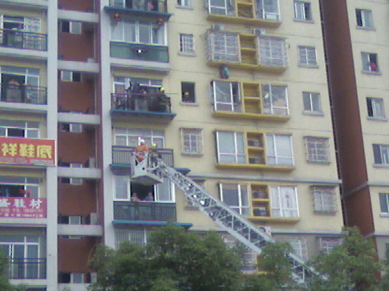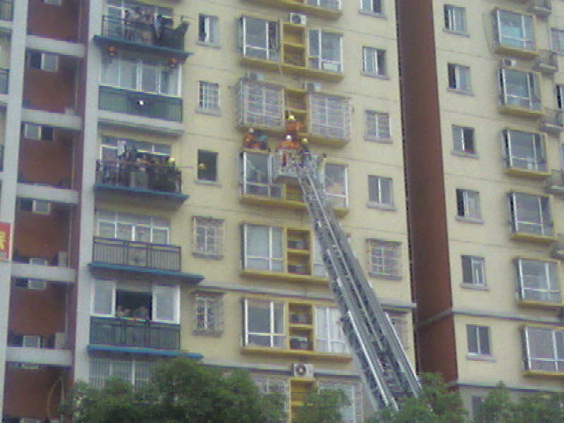慢慢接近中··云梯上的消防员和跳楼者不停的对话················