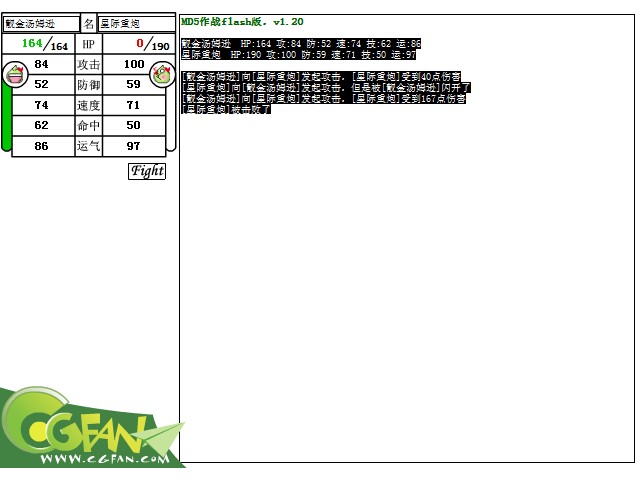 [靓金汤姆逊]向[星际重炮]发起攻击,[星际重炮]受到40点伤害[星际重炮]向[靓金汤姆逊]发起攻击,但是被[靓金汤姆逊]闪开了[靓金汤姆逊]向[星际重炮]发起攻击,[星际重炮]受到167点伤害[星际重炮]被击败了